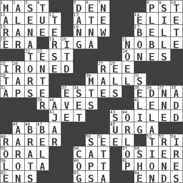 ACROSS 1. Vertical spar for supporting sails 5. Lair 8. Pacific Standard Time (abbr.) 11. Native American of Southwest Alaska 13. Had dinner 14. Writer Wiesel 15. Indian princess (variant) 16. Compass dir. 17. Waist strap 18. Epoch 19. Capital of Latvia 21. Impressive in appearance 22. Trial 24. Singles 25. Pressed 27. Portuguese money of account (variant) 29. Small pie 30. Promenades 32. Domed church section 33. _____ Park, CO 35. Pulitzer Prize-winning author Ferber 39. All-night dance parties 41. Grant temporary use of 42. _ stream 43. Dirtied 45. Swedish rock group 48. Capital and largest city of Mongolia 49. More uncommon 50. Sew up the eyelids of hawks and falcons 52. Three (prefix) 55. Relating to the mouth 56. Feline 57. Flexible twig of a willow tree 59. Globular water bottle used in Asia 60. Choose 61. Give a jingle 62. Followers of ems 63. Girls' org. (abbr.) 64. Conclusions DOWN 1. Female horse 2. Having or resembling wings 3. Elected representatives 4. Third day of the wk. 5. Mild oath, euphamism for damn 6. Inactive volcano in Sicily 7. ___ Haven, CT 8. Cadet 9. Beverly of Met fame 10. Wig 12. Laconic 14. Inky black, to poets 20. It would 21. Christmas carol 23. Keyboard key 25. Call ___ day 26. Reproach for some lapse or misdeed 27. Actress Charlotte 28. Raised railways 30. Mountains (abbr.) 31. Former Milwaukee Brewers owner Bud 33. Night before a holiday 34. Arrange properly for use 36. Accusation by an informer 37. Compass dir. 38. Find the sum of 40. Partly open 43. Institute legal proceedings 44. Lowest deck of a ship 45. Composer Copland 46. Naughty children 47. Actor Lugosi 49. Hero or heavy, e.g. 50. Plant excrements 51. Singer James 53. Tear apart 54. Angers 56. Gear tooth 58. A female animal or person
