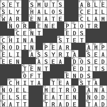 ACROSS 1. Arrange properly for use 4. Particles of soot 9. Competent 13. Mischievous 14. Auras 15. To provide with a ceiling 16. Armed conflict 17. Maternal 18. Burrowing marine mollusk 19. Not either 21. Compass dir. 22. Peter (Polish) 24. Penny 26. Begley and Asner 27. Large country 29. Proofreading order 30. "The Thinker" sculptor 31. Lightbulb-shaped fruit 33. Electrical Unit 36. Connecticut Ivy Leaguer 37. Nineveh was its capital 40. Ocean 41. Car or cant ending 42. At sea 43. Administered medicine 45. Portable shelter 47. Proofreads 48. Often (poetically) 49. Extremities 50. Riviera of "Kiss of the Spider Woman" 52. Beverage made from leaves 54. R.R. building 56. Christmas carol 57. Paris' subway 59. Santa ___, CA 61. Otherwise 62. Ingested 63. Dreamland 64. Electrical Unit 65. Barter 66. Small boy DOWN 1. Compass dir. 2. Enthusiasm 3. Polypeptide antibiotic 4. A female animal or person 5. French painter Edouard 6. Uhlan (variant) 7. Haul 8. Compass dir. 9. Buttonhole 10. Waist strap 11. One who doesn't tell the truth 12. Shade tree 20. Painter Guido (1575-1642) 22. _ dish (used to culture cells) 23. Binary compound 25. Nanny 27. Algonquian 28. Opening into or through something 29. "Two Mules for Sister ____" 31. Inconspicuous attention getter 32. Sight organ 33. Helper 34. Rendezvous 35. Writing tablets 38. Before Barbara or Clara 39. An important port of Yemen 44. Likelihood 45. Rest room 46. Bank Draft (abbr.) 49. Having ears or earlike features 50. Root beer relative 51. Behest 52. Lacerate 53. Singer James 55. Small Philippine buffalo 56. ___ Haven, CT 57. Was introduced to 58. Single 60. Say or write further