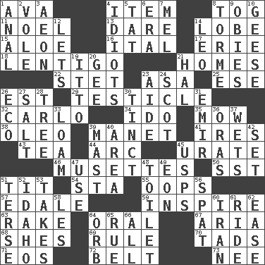 ACROSS 1. Actress Gardner 4. A whole individual unit 8. Coat; cloak 11. Christmas carol 13. Have the gumption 14. Ear part 15. Medicinal plant 16. Slanted text style (abbr.) 17. 4th largest of the Great Lakes 18. Small, flat, pigmented spot on the skin 21. Residences 22. Proofreading order 23. White ___ sheet 25. Compass dir. 26. Eastern Standard Time (abbr.) 29. One of the two male reproductive glands 32. Monte _, Las Vegas Hotel/Casino 34. Wedding promise 35. Cut the grass 38. Margarine 39. French painter Edouard 41. Angers 43. Afternoon social gathering 44. Curve 45. A salt of uric acid 46. French bagpipes 50. Fast jet (abbr.) 51. Teat (slang) 54. R.R. building 55. I made a mistake 57. Peak District village in England 59. Motivate 63. Libertine 64. Taken by mouth 67. Roberta Peters solo 68. "______ My Girl" (Turtles hit) 69. General guideline 70. Small boys 71. Greek goddess of the dawn 72. Waist strap 73. Born DOWN 1. Of or related to the anus 2. Grand slam 3. A really long time 4. Foolish or stupid persons 5. Make lace 6. Period 7. Cartoonist voice _ Blanc 8. Singer Mel 9. Off-Broadway awards 10. Honkers 12. Allows 14. Lion 19. "Tell ____ the Marines!" 20. Turn to the right 21. Actor Linden 23. Helper 24. Native of Scotland 26. Environmental prefix 27. Table seasoning 28. Family _ (genealogy) 30. A color or tint 31. Arab leader 33. Rich soil 36. Mouths or openings 37. Soaks 39. Vertical spar for supporting sails 40. Type of rug 42. Arrange properly for use 45. United States Postal Service (abbr.) 47. Purpose 48. Rest room 49. A really long time 51. Laconic 52. Potato state 53. Proceeds 56. Petty quarrel 58. French article 60. SW Asia republic 61. Travel on an animal 62. Relaxation 64. Globe 65. Regret 66. Everything