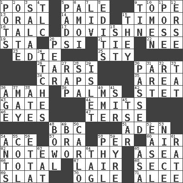 ACROSS 1. Mail 5. Light colored 9. Drink excessively 13. Spoken 14. Among 15. The easternmost of the Lesser Sundas 16. Baby powder 17. Innocence, gentleness, or tenderness 19. R.R. building 20. 23rd letter of the Greek alphabet 21. Standoff 22. Born 23. Singer Brickell 25. Filthy place 26. Tarsus (plural) 30. Component 34. Dice game 35. Type of rug 36. Nanny 39. Insides of hands 42. Proofreading order 43. Yard entry 44. Gives off 46. Snake ____ (dice throw) 47. Laconic 48. English channel? 51. An important port of Yemen 54. Adept person 57. Mouth or opening 58. For each 60. Wind 62. Music shop? 65. Toward the sea 66. Add up to 67. Den 68. Religious group 69. Narrow board 70. Stare at amorously 71. Toward shelter DOWN 1. Plant holders 2. Declaim 3. First course 4. Affectionate concern, for short 5. Writing tablets 6. Mine, in Marseilles 7. 54 in ancient Rome 8. Prepares for publication 9. Shallow baking pan 10. Sign of something about to happen 11. Introduce or present, as a question 12. Celtic language 15. Those things 18. Be seated 20. Lightbulb-shaped fruit 24. Skin irritations 27. Hit sharply and swiftly 28. Health resort 29. Small island 30. Went by 31. Tate display 32. To separate or throw off 33. Make lace 36. Mature 37. Fifth month 38. Had dinner 40. Madame (abbr.) 41. Title for a knight 45. Russian ruler of old 48. Soup holder 49. Sis' sibling 50. Monte _, Las Vegas Hotel/Casino 52. Artist's stand 53. Sibling's daughter 54. Pismires 55. Calm and collected 56. Singer James 58. Silvers or Donahue 59. Jane of fiction 61. Pace 63. Consume 64. Label 65. White ___ sheet