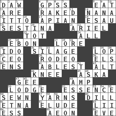 ACROSS 1. Fool 4. Global Positioning Systems (abbr.) 8. Erode 11. "We ___ not amused" (Victoria) 12. Moved through 14. Nanny 15. "Tell ____ the Marines!" 17. Bee-related 18. Son of Isaac 19. French poetic form 21. Satellite of Uranus 23. Small child 24. 100% 25. Inky black, to poets 27. Old wives' tales, e.g. 30. Wedding promise 31. Fodder prepared in a silo 34. Trim (branches) 37. Corporate head (abbr.) 38. Cowboy competition 39. Raised railways 40. Followers of ems 41. Most capable 43. Keyboard modifier key 44. Leg joint 45. "____ silly question..." 47. Unit of force equal to gravity 49. Electrical Unit 50. Inn 52. Substance 56. Stitched 57. Entertaining tales 60. Deli pickle 61. Inactive volcano in Sicily 62. Dodge 63. Cards in a Roman deck? 64. Double-curved letter 65. Period of immesurable duration 66. Night before a holiday DOWN 1. Raised platform 2. Johnson of "Laugh-In" 3. Soaks 4. Let have 5. Dad 6. What Jean-Claude Killy likes to do 7. Ocean 8. Artist's stand 9. Of or related to the anus 10. The 19th letter of the Greek alphabet 13. Heredity factor (abbr.) 14. Famous astronaut Armstrong 16. "Beetle Bailey" pooch 20. Charged atoms 22. Actress Charlotte 25. Locale of original sin 26. Scornful sounds 27. Dipping utensil 28. Double curve, resembling the letter S 29. Vintage cars 30. Frozen water 32. SW Asia republic 33. Ear part 34. Path through which fluid escapes 35. Spanish pot 36. Pacific Standard Time (abbr.) 42. Scottish caps 44. Barrel 46. Broke a traffic law 47. Long dresses 48. Pulitzer Prize-winning author Ferber 49. NE Netherlands city 50. Allows 51. Sight organ 52. Inside; within (prefix) 53. The longest river in the world 54. 154 in Roman numerals 55. Writer Wiesel 56. Perceive with the eye 58. Wing 59. Sorrow