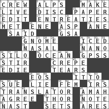 ACROSS 1. Ship's personnel 5. High mountains 9. Cause to be 13. Moving, as bait 14. Compact _ 15. Some stationery 16. Prepare for publication 17. Pleas 19. Was introduced to 20. Compass dir. 21. Cleo's killer 22. A saturated hydrocarbon 23. Expressed in words 25. Girls' org. (abbr.) 26. Dwarf 30. On the rocks 34. Rhinal 35. Billionth: prefix 36. Grain storage tower 39. Sea 42. Global Positioning Systems (abbr.) 43. Commotion 44. Streamer paper 46. Singer Brickell 47. Pulls apart 48. Greek goddess of the dawn 51. "Tell ____ the Marines!" 54. Institute legal proceedings 57. Whopper 58. Opposite of masc. 60. Big collection agency 62. Interpreter 65. Wet nurse 66. Match 67. Son of Odin 68. Short letter 69. Political cartoonist Thomas 70. Arranges properly for use 71. Ancient Greek god of war DOWN 1. Clement's nick name 2. Amusement-park features 3. Webber/Rice musical 4. Soggy 5. An important port of Yemen 6. Actor's bit 7. Pacific Standard Time (abbr.) 8. Lean end of the neck 9. Floor protector 10. Capital of Western Samoa 11. Peachy ____! 12. Celtic language 15. Dad 18. Double-curved letter 20. Pulitzer Prize-winning author Ferber 24. Snub 27. Bear (Spanish) 28. Apple computer (short form) 29. Voters do this 30. Eat 31. Head covering 32. Followers of ems 33. Two (Sp.) 36. Compass dir. 37. It would 38. Cards in a Roman deck? 40. "We ___ not amused" (Victoria) 41. Teachers' org. 45. Demure 48. Otherwise 49. Petroleum 50. Theater features 52. The easternmost of the Lesser Sundas 53. Declaim 54. Comedian Laurel of Laurel & Hardy 55. Capital and largest city of Mongolia 56. Hearing organs 58. One third of a yard 59. Blunders 61. "______ My Girl" (Turtles hit) 63. Remaining after all deductions 64. Definite Article 65. Santa ___, CA