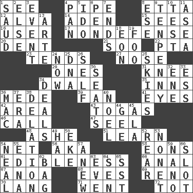 ACROSS 1. Observe 4. Corncob 8. Singer James 12. Inventor's middle name 14. An important port of Yemen 15. Observes 16. One who makes use of a thing 17. Unrelated to defense, as in spending 20. Gouge 21. "Barney Miller" actor Jack 22. Parent Teacher Association (abbr.) 23. Watches over 27. Olfactory organ 29. Singles 31. Leg joint 34. A sleeping potion; an opiate (poet.) 35. Restaurants 36. Ancient Persian 39. Avid follower 41. Sight organs 42. Type of rug 43. Ancient Roman robes 46. Give a ring to 47. Stitch closed the eyes of (a falcon) 48. American tennis player Robert 51. Memorize 54. Remaining after all deductions 56. Alias (abbr.) 58. Immeasurably long periods of time 61. The property of being fit to eat 66. Of or related to the anus 67. Small Philippine buffalo 68. Nights before holidays 69. Former U.S. Attorney General Janet 70. Long (Scottish) 71. Gone 72. Small child DOWN 1. Saudi Arabian king (1953-1964) 2. Otherwise 3. Incident 4. Baking dish 5. Wedding promise 6. Animal enclosure 7. Extremities 8. Compass dir. 9. 3-inch nail 10. Trial 11. At sea 13. Johnson of "Laugh-In" 18. Period of immesurable duration 19. Egg _ yung 24. At this time 25. Heredity factor (abbr.) 26. Oneself 28. Atmospheres 30. Theater features 32. Compass dir. 33. Curvy letter 34. Allots cards 36. Apple computer (short form) 37. Epoch 38. Conveyance 40. Christmas carol 44. Unit of force equal to gravity 45. Wing 49. Actor Linden 50. Make supply last 52. Hitchcock's "____ Window" 53. Music written for nine 54. Actress Patricia 55. Pulitzer Prize-winning author Ferber 57. Afresh 59. Billionth: prefix 60. Position in a hierarchy or organization 62. Paper or plastic container 63. Night before a holiday 64. Elected rep. 65. Fast jet (abbr.)