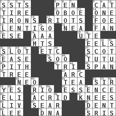 ACROSS 1. Fast planes 5. Writing instrument 8. Domesticated feline 11. Hoop that covers a wheel 12. Mitch Miller's instrument 14. Single 15. Removes the wrinkles 17. Disturbances 18. Enemy 19. Small, flat, pigmented spot on the skin 21. Teachers' org. 22. Avid follower 23. Compass dir. 24. American Automobile Association (abbr.) 25. Shoshoni 27. Mountains (abbr.) 28. Snakelike fish 31. Narrow, elongated depression 35. And so on (abbr.) 37. Highlander 38. Comfort 39. "Barney Miller" actor Jack 41. Ballerina skirt 42. Essential or central part 43. Three (prefix) 45. Connect, as a bridge 46. Woody plant 47. Curve 49. Modern: prefix 51. Afternoon social gathering 52. Title for a knight 55. Consenting reply 57. River (Sp.) 60. Core 62. Connecticut Ivy Leaguer 63. Bitter 65. Leg joints 66. 54 in ancient Rome 67. Dry up 68. Gouge 69. Area sheltered from the wind 70. Heredity factor (abbr.) 71. Indian titles of respect DOWN 1. Vertical member of a panel or frame 2. Titles for men of rank and authority 3. Heavy duty weighing machine 4. Posted 5. Luau course 6. Inky black, to poets 7. Brief written record 8. Java holder (2 wds.) 9. Small Philippine buffalo 10. Adolescent 13. He sold his birthright 16. Thailand, formerly 17. Exposes to great heat 20. Yard entry 26. Trials 29. Globular water bottle used in Asia 30. Make senseless or dizzy 31. Back-to-school mo. 32. Den 33. Clearly or manifestly demonstrative 34. Giggle 36. Small bed 40. Declaimed 44. Angers 48. Keg 50. Mouths or openings 52. Scornful expression 53. Ancient Celtic tribe of eastern Britain 54. Musical pauses 55. Shout 56. Writer Wiesel 58. On the rocks 59. Northwest Algerian city 61. Extremities 64. Retirement account (abbr.)
