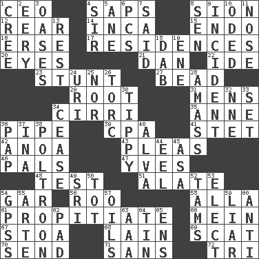 ACROSS 1. Corporate head (abbr.) 4. Plant excrements 8. The Jewish people; Israel 12. Located in or toward the back 14. South American Indian 15. Inside; within (prefix) 16. Celtic language 17. Homes 20. Sight organs 21. One of the 12 tribes of Israel 22. Binary compound 23. Difficult or unusual or dangerous feat 27. Necklace unit 29. Carrot, for example 31. Not women's 34. High-altitude cloud 35. Queen of England 1702-14 36. Corncob 39. Numbers guy (abbr.) 41. Proofreading order 42. Small Philippine buffalo 43. Entreaties 46. Friends 47. Jacques Cousteau's middle name 48. Trial 51. Having winglike extensions 54. Slender fish 56. Friend of Pooh 58. Silent film actress Nazimova 61. Appease 66. Chow _ 67. Portico 68. (Had) reclined 69. Scram, to a cat 70. Transmit 71. Without 72. Three (prefix) DOWN 1. Algonquian 2. Suggestive of the supernatural 3. Fertile tracts in a desert 4. Title for a knight 5. One (Scot) 6. Personal Computers (abbr.) 7. Expressed in words 8. Elected rep. 9. Event 10. Wrote a lyric poem 11. Sense of smell 13. Repose 18. Small moist lump or mass 19. Compass dir. 24. RI univ. 25. And not 26. Torque (variant) 28. Collect or gather 30. Likely to tip or tilt 32. Compass dir. 33. Arrange properly for use 34. Stop 36. Infant food 37. _ tizzy (2 wds.) 38. Coward 40. Inventor's middle name 44. Snakelike fish 45. White ___ sheet 49. _ Lanka 50. Small child 52. Scottish caps 53. Opt 54. Global Positioning Systems (abbr.) 55. Johnson of "Laugh-In" 57. Lubricates 59. One who doesn't tell the truth 60. Against 62. Groovy apt. 63. American Automobile Association (abbr.) 64. Shallow baking pan 65. Followers of ems