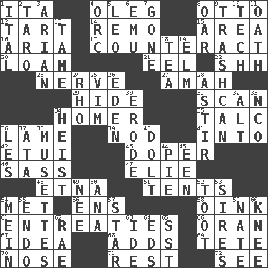 ACROSS 1. Call ___ day 4. Cassini of fashion 8. "Beetle Bailey" pooch 12. Small pie 14. San ____ (Riviera town) 15. Length times width 16. Operatic vocal solo 17. Act in opposition 20. Rich soil 21. Snakelike fish 22. Quiet! 23. Boldness 27. Nursemaid 29. Flintstone garb 31. Examine hastily 34. Home run 35. Baby powder 36. Unable to walk 39. Dreamland 41. To the inside or interior of 42. Needle case 43. Drug addict 46. Backtalk 47. Writer Wiesel 48. Inactive volcano in Sicily 51. Portable shelters 54. Was introduced to 56. Followers of ems 58. Pig sound 61. Pleas 66. NW Algerian seaport 67. The content of cognition 68. Does sums 69. False hair 70. Characteristic smell of wine 71. State of inaction 72. Perceive with the eye DOWN 1. Slanted text style (abbr.) 2. Edible starchy tuberous root 3. Believer in; advocate of (suffix) 4. The grampus (Milton) 5. Lion 6. Australian flightless bird 7. Went 8. Boat paddle 9. File 13 10. Technical 11. Pledge 13. Not wild 18. Afternoon social gathering 19. Shade tree 24. 17th letter of the Greek alphabet 25. Zeal 26. Genesis locale 28. Moving or stirring 30. Wear away 32. The first octave above the treble staff 33. Non-commissioned officer (abbr.) 34. Robbery 36. French article 37. "One Day ___ Time" 38. French bagpipes 40. Dunce 44. Sliced dessert 45. Car or cant ending 49. Born 50. Santa ___, CA 52. A blast of a horn 53. Fathers 54. Chow _ 55. Inside; within (prefix) 57. Play the lead 59. Nathan's nickname 60. Leg joint 62. Actress Charlotte 63. Binary compound 64. Begley and Asner 65. Fast jet (abbr.)