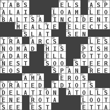 ACROSS 1. Bar bills 5. Raised railways 8. Viper 11. Jai _ 12. Rich soil 13. Lion 14. Greek mezzo-soprano Agnes 17. Happening 19. Ear of corn 21. Opts 22. Narrow board 23. Elected rep. 24. Retirement account (abbr.) 27. Arches 29. French article 32. Wanderer 34. Part of HMS, perhaps 36. Expression of disdain 37. The sixth month of the Jewish calendar 38. Pipe bend 39. "Beetle Bailey" pooch 40. Egg locale 41. "Barney Miller" actor Jack 42. Bull 43. Greek goddess of the dawn 44. Connect, as a bridge 46. To riddle 47. Nanny (var.) 50. Greek god of love 52. Spoke pompously 55. Foolish or stupid persons 57. Accusation by an informer 59. Ringlike coral islands and reefs 62. Compass dir. 63. Roll call or roster of names 64. Plunder 65. Observe 66. Eastern Standard Time (abbr.) 67. Singer James DOWN 1. Keyboard key 2. In the manner of 3. Lip ointment 4. Locates 5. A really long time 6. Shoestrings 7. Grin 8. Actor Baldwin 9. Emitted 10. Plant holders 12. Falsehood 15. Vegetable dish 16. Having or resembling wings 18. Lair 20. Irritating cutaneous sensations 24. Lacking in sense or substance 25. Cowboy competition 26. Collect or gather 28. Grain storage towers 29. 61 cubic inches 30. First name in cosmetics 31. Dinah or Pauly 33. Tate display 35. Slanted 36. Plant holder 42. Snob 45. Operatic vocal solo 47. _ moment's notice (2 wds.) 48. Distance measurement (Brit.) 49. Goodbye (Sp.) 51. Took without asking 52. Lyric poems 53. French philosopher Descartes 54. Toward shelter 55. _ tizzy (2 wds.) 56. Narrow, elongated depression 58. Baseball player Mel 60. Car dealer's back yard 61. R.R. building