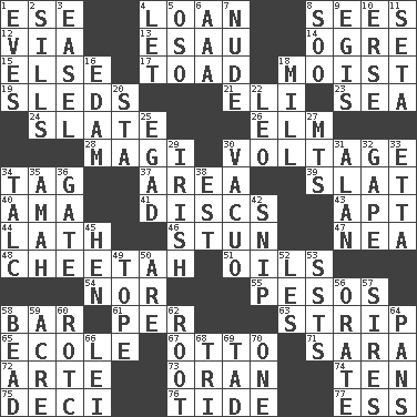 ACROSS 1. Compass dir. 4. Grant temporary use of 8. Observes 12. By way of 13. Son of Isaac 14. Legendary monster 15. Otherwise 17. Frog relative 18. Damp 19. Bobsleighs 21. Biblical high priest 23. Ocean 24. Chalkboard 26. Shade tree 28. Wise men 30. Electrical Measurement 34. Label 37. Length times width 39. Narrow board 40. Nursemaid (var.) 41. Plates 43. Fitting 44. Thin strip of wood or metal 46. Make senseless or dizzy 47. Teachers' org. 48. Leopard's kin 51. Lubricates 54. And not 55. Mexican monetary units 58. Oblong piece of solid material 61. For each 63. Remove all contents or possession from 65. Learning spot: Fr. 67. "Beetle Bailey" pooch 71. "Two Mules for Sister ____" 72. Johnson of "Laugh-In" 73. NW Algerian seaport 74. "___ Little Indians" 75. Tenth: prefix 76. Periodic rise and fall of the sea level 77. Double-curved letter DOWN 1. Nights before holidays 2. Beverly of Met fame 3. Artist's stand 4. Allow 5. Bear (Spanish) 6. Auto club (abbr.) 7. Naked 8. "Barney Miller" actor Jack 9. The front part of a cuirass 10. Celtic language 11. Stalk of a moss capsule 16. Dutch treat 18. Place where flour is made 20. R.R. building 22. Lion 25. Mild oath 27. Mountains (abbr.) 29. From or relating to Ireland 30. In a vacuum (with "in") 31. ____ Jay Lerner 32. Stare wonderingly 33. Singer James 34. Baby powder 35. Wet nurse 36. Yard entry 38. Eastern Standard Time (abbr.) 42. Clip 45. Layer 49. Drink excessively 50. "We ___ not amused" (Victoria) 52. French article 53. Fast planes 56. Declaim 57. Fathers 58. Necklace unit 59. 43,560 square feet 60. College mil. group 62. Carrot, for example 64. Zero-star reviews 66. Luau accessory 68. Three (prefix) 69. Small boy 70. Single