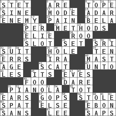 ACROSS 1. Proofreading order 5. "We ___ not amused" (Victoria) 8. Drink excessively 12. Trig term 13. Method 15. The sixth month of the Jewish calendar 16. Foe 18. Ache 19. Actor Lugosi 20. For each 22. Modes 24. Writer Wiesel 26. Friend of Pooh 27. Groove 28. Arrange properly for use 29. _ Lanka 32. Costume for a special activity 35. Hollow 37. Nine, plus one 38. Blunders 39. Lyricist Gershwin 40. Vertical spar for supporting sails 41. Mature 42. Get outta here! 43. To (old English) 44. French article 45. It is 46. Nights before holidays 49. Egg _ yung 50. Have the gumption 51. Player piano 55. Small child 56. Hearing organs 57. Republicans 59. Fur scarf 63. Argument over a trivial matter 64. Otherwise 65. Inky black, to poets 66. Without 67. Area sheltered from the wind 68. Plant excrements DOWN 1. Compass dir. 2. Metal container 3. Compass dir. 4. Storms 5. Electrical Unit 6. Wander aimlessly 7. Singer Brickell 8. Off limits 9. Wrote a lyric poem 10. Friends 11. Period 14. Main course 17. Shout 21. _ de Janeiro 23. Being at a high temperature 25. Principles of right and wrong 28. Scheduled 29. Comedian Laurel of Laurel & Hardy 30. Respite 31. To the inside or interior of 32. Lick closed 33. Goad 34. Angers 36. Mouth or opening 40. French bagpipes 42. Moe Howard, for one 45. Electrically charged atom 47. Large container 48. Greek god of love 49. Goes without food and/or water 51. Dad 52. SW Asia republic 53. Hang loosely or laxly 54. Domed church section 56. Curvy letter 58. Observe 60. Chief or king in Benin or Nigeria 61. Trim (branches) 62. Followers of ems