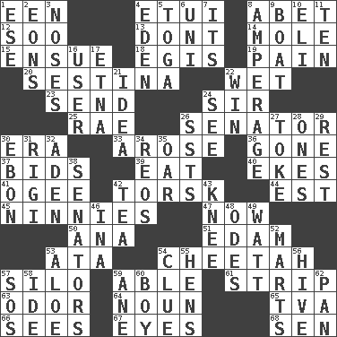 ACROSS 1. Car or cant ending 4. Needle holder 8. Collude with 12. "Barney Miller" actor Jack 13. Do not 14. Undercover agent 15. Follow as a consequence or result 18. Armor plate that protects the chest 19. Ache 20. French poetic form 22. Dripping 23. Post 24. Title for a knight 25. Actress Charlotte 26. Elected representative 30. Period 33. Came up 36. Went 37. Auction offers 39. Consume 40. Supplements with great effort 41. Double curve, resembling the letter S 42. Cod relative 44. Eastern Standard Time (abbr.) 45. Fools 47. At this time 50. Santa ___, CA 51. Dutch treat 53. _ moment's notice (2 wds.) 54. Leopard's kin 57. Grain storage tower 59. Competent 61. Long narrow piece of something 63. Scent 64. Part of speech 65. Federal power corp. 66. Perceives with the eye 67. Sight organs 68. Elected rep. DOWN 1. Compass dir. 2. Immeasurably long periods of time 3. Olfactory organs 4. Locale of original sin 5. Ancient Roman robe 6. Single; one (prefix) 7. ___ a Wonderful Life 8. Electrical Measurement 9. Water vessel 10. Biblical high priest 11. "___ Little Indians" 16. One who uses or employs something 17. Inactive volcano in Sicily 21. The main thing one is thinking about 22. Acquire through effort 24. Observe 26. Fast planes 27. Casino tip 28. Singles 29. State of inaction 30. Inky black, to poets 31. Swiss mountan, "Queen of the Mountains" 32. Arabian gulf 34. Vintage cars 35. Rowing implement 38. Elected representatives 42. Afternoon social gathering 43. Leg joint 46. _ tizzy (2 wds.) 48. Lyric poems 49. Electrical Unit 52. Shops 53. Medicinal plant 54. A slight indication 55. Coop moms 56. Hub of activity 57. Mayday 58. Binary compound 59. A saturated hydrocarbon 60. Male child 62. Baking dish