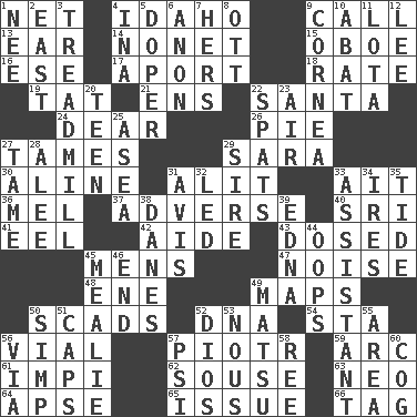 ACROSS 1. Fish or hair follower 4. Potato state 9. Give a ring to 13. Hearing organ 14. Music written for nine 15. Mitch Miller's instrument 16. Compass dir. 17. To the left, to Queeg 18. Assign a rank or rating to 19. Make lace 21. Followers of ems 22. Before Barbara or Clara 24. Letter starter 26. Sliced dessert 27. Makes less strong or intense 29. "Two Mules for Sister ____" 30. Place in a line 31. Came down and settled, as after flight 33. Small island 36. Cartoonist voice _ Blanc 37. Contrary to your interests or welfare 40. _ Lanka 41. Snakelike fish 42. Assistant 43. Administered medicine 45. Not women's 47. Annoying sound 48. Compass dir. 49. Atlas contents 50. Large numbers or amounts 52. Heredity factor (abbr.) 54. R.R. building 56. Small bottle 57. Peter (Polish) 59. Curve 61. Body of Kaffir warriors 62. Boozer 63. Modern: prefix 64. Domed church section 65. Come out of 66. Label DOWN 1. Born 2. Compass direction 3. Excercise machine 4. _ tizzy (2 wds.) 5. Drug addict 6. Soon (poet.) 7. Possessive pronoun 8. Baseball player Mel 9. Pupil covering 10. Blind as ____ 11. Globular water bottle used in Asia 12. Area sheltered from the wind 20. Adolescent 22. Arguments over trivial matters 23. Wind 25. Toward the sea 27. Docile 28. Toward shelter 29. The founder of a family 31. Advice 32. Directed 33. Aide 34. Angers 35. Event that recurs at intervals 38. Natives or inhabitants of Denmark 39. Pulitzer Prize-winning author Ferber 44. I made a mistake 45. Ear of corn 46. Conclude 49. Taiwanese island in East China Sea 50. Simple or foolish person 51. Balmoral and tarboosh 52. "Vaya con ____" 53. Good sense 55. Type of rug 56. By way of 57. Air pressure measure (abbr.) 58. Portuguese money of account (variant) 60. Gear tooth