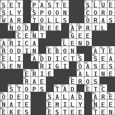 ACROSS 1. Put into a specified state 4. Thick mixture 9. Turn sharply 13. Cunning 14. Soup utensil 15. Drawstring 16. Armed conflict 17. For Whom the Bell _____ 18. Mouths or openings 19. Allow head to fall sleepily 21. To riddle 22. Showery time 24. Penny 26. Turn to the right 27. N. Chile seaport 29. Grant temporary use of 30. "The Thinker" sculptor 31. Inky black, to poets 33. Had dinner 36. Connecticut Ivy Leaguer 37. Inveterate users 40. Ocean 41. Elected rep. 42. Swiss mountan, "Queen of the Mountains" 43. Fertile tracts in a desert 45. 4th largest of the Great Lakes 47. Place in a line 48. Actress Charlotte 49. Greek god of love 50. Closes up, plugs up 52. Small amount or degree 54. And so on (abbr.) 56. Wrote a lyric poem 57. First course 59. "We ___ not amused" (Victoria) 61. Nathan's nickname 62. Poet Dickinson 63. Born 64. Makes supply last 65. First name in cosmetics 66. "___ Little Indians" DOWN 1. Compass dir. 2. Style 3. Polypeptide antibiotic 4. Pacific Standard Time (abbr.) 5. To the left, to Queeg 6. Flatfish 7. Lacquered or enameled metalware 8. Followers of ems 9. Tallied 10. Australian parrot (variant) 11. Mountain range 12. Begley and Asner 20. Tenth: prefix 22. Rep 23. Animal enclosure 25. Nanny 27. Ancient Greek god of war 28. Hero or heavy, e.g. 29. Venues 31. Singer Brickell 32. Massive 33. Helper 34. Adolescent 35. Comfort 38. Frees from moisture 39. Fly high 44. Medicinal plant 45. Eats (away) 46. Reproach for some lapse or misdeed 49. Peak District village in England 50. Neighbor of Neb. 51. Wig 52. Scottish caps 53. Came down and settled, as after flight 55. Algonquian 56. Single 57. Observe 58. Color 60. Car or cant ending