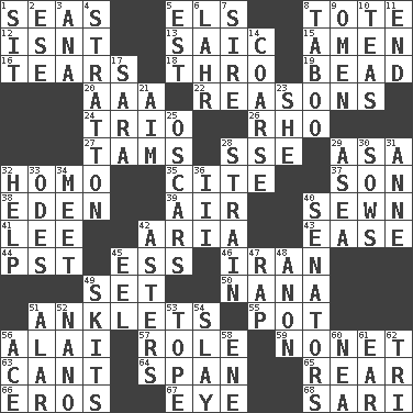 ACROSS 1. Oceans 5. Raised railways 8. Carryall 12. Is not 13. Ketch in the Levant 15. So be it 16. Pulls apart 18. Through, poetically 19. Necklace unit 20. American Automobile Association (abbr.) 22. Thinks logically 24. Musical group of three 26. 17th letter of the Greek alphabet 27. Scottish caps 28. Compass dir. 29. White ___ sheet 32. Same (prefix) 35. Quote 37. Boy, to dad 38. Locale of original sin 39. Wind 40. Stitched 41. Area sheltered from the wind 42. Roberta Peters solo 43. Comfort 44. Pacific Standard Time (abbr.) 45. Curvy letter 46. SW Asia republic 49. Arrange properly for use 50. Nanny 51. Short socks 55. Cooking vessel 56. Jai ____ 57. Hero or heavy, e.g. 59. Music written for nine 63. Patter 64. Connect, as a bridge 65. Posterior 66. Greek god of love 67. Sight organ 68. Indian skirt DOWN 1. Be seated 2. Compass dir. 3. Santa ___, CA 4. Ski resort town in Vermont 5. Eastern Standard Time (abbr.) 6. Cowardly lion portrayer 7. Title for a man of rank and authority 8. Off limits 9. Sign of things to come 10. Beverages made from leaves 11. Conclude 14. Unrefined 17. "Two Mules for Sister ____" 21. Direct toward a target or goal 23. A female animal or person 25. Motion picture awards 28. Put through a sieve 29. At sea 30. Sty mamas 31. Queen of England 1702-14 32. Aid 33. Lyric poems 34. Confront 36. One more than two 40. Legislators 42. Michaelmas daisies 45. Snakelike fish 47. Strike 48. At once, immediately (arch.) 49. Burlesque acts 51. Having or resembling wings 52. Billionth: prefix 53. Drink excessively 54. Kill 56. Adept person 58. Compass dir. 60. Teachers' org. 61. Hearing organ 62. Three (prefix)