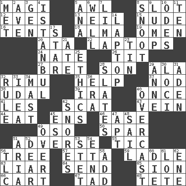 ACROSS 1. Wise men 5. Leather borer 8. Position in a hierarchy or organization 12. Nights before holidays 13. Famous astronaut Armstrong 15. Unadorned 16. Portable shelters 18. _ mater 19. Sign of something about to happen 20. "One Day ___ Time" 22. Portable computers 24. Nathan's nickname 26. Teat (slang) 27. Cy Young winner Saberhagen 28. Manchild 29. According to 32. Tall New Zealand timber tree 35. Assist 37. Lower and raise head in agreement 38. Hereditary estate 39. Retirement account (abbr.) 40. At one time in the past 41. French article 42. Scram! 43. Distinctive style or manner 44. Ingest 45. Followers of ems 46. Comfort 49. Bear (Spanish) 50. Practice fight 51. Contrary to your interests or welfare 55. Nervous spasm 56. Family _ (genealogy) 57. Singer James 59. Dipping utensil 63. One who doesn't tell the truth 64. Post 65. The Jewish people; Israel 66. Haul 67. Small amount or degree 68. Wig DOWN 1. Was introduced to 2. "___ Maria" 3. Commissioned mil. rank 4. Byzantium, centuries later 5. Santa ___, CA 6. Water source 7. Pale green bean 8. Snout, nose 9. Mass 10. Lyric poems 11. Nine, plus one 14. Portable computer 17. Play the lead 21. Had dinner 23. Metal container 25. Moral principles 28. Chalkboards 29. Singer Murray 30. Venues 31. Arabian gulf 32. Court order 33. The content of cognition 34. Vertical spar for supporting sails 36. Period 40. Cloudy 42. Sounds asleep 45. Compass dir. 47. Fitting 48. Travel by water 49. Unconcealed 51. Operatic vocal solo 52. Letter starter 53. Proofreading order 54. Inactive volcano in Sicily 56. Affectionate concern, for short 58. Say or write further 60. Pass on 61. Car dealer's back yard 62. Compass dir.
