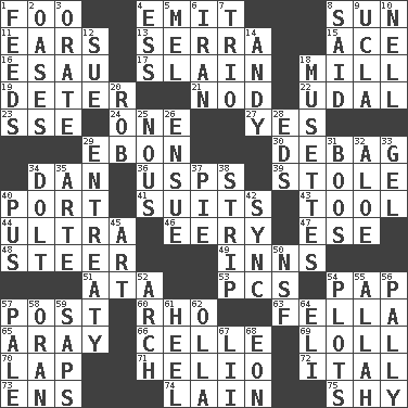 ACROSS 1. Egg _ yung 4. Give off 8. Player for Phoenix 11. Hearing organs 13. Spanish missionary in California 15. Adept person 16. Son of Isaac 17. Killed 18. Place where flour is made 19. Prevent from occurring 21. Lower and raise head in agreement 22. Hereditary estate 23. Compass dir. 24. Single 27. Consenting reply 29. Inky black, to poets 30. Debunk (Brit. slang) 34. Daniel's nick name 36. United States Postal Service (abbr.) 39. Took without asking 40. Left side of a ship or aircraft 41. Sets of matching outer garments 43. Instrument 44. Extreme 46. Suggestive of the supernatural 47. Compass dir. 48. Navigate 49. Restaurants 51. "One Day ___ Time" 53. Personal Computers (abbr.) 54. Infant food 57. Mail 60. 17th letter of the Greek alphabet 63. Chap (slang) 65. Like ___ of sunshine 66. Cell (Danish) 69. Hang loosely or laxly 70. Pet locale 71. Sun: prefix 72. Slanted text style (abbr.) 73. Followers of ems 74. (Had) reclined 75. Like a shrinking violet DOWN 1. Eats 2. Fertile tracts in a desert 3. Declaim 4. Double-curved letter 5. Cartoonist voice _ Blanc 6. SW Asia republic 7. Musical group of three 8. Expressed in words 9. Southern CA. univ. 10. 1994 drama film starring Jodie Foster 12. Institute legal proceedings 14. Actor Griffith 18. French bagpipes 20. Director Reiner 25. Horse sense 26. Take place subsequently 28. Begley and Asner 29. Plea 31. Scornful sounds 32. Medicinal plant 33. Set 34. Stupid person 35. Johnson of "Laugh-In" 37. Sliced dessert 38. Remove all contents or possession from 40. Product of festering 42. Synchronize (abbr.) 45. Tate display 50. Overdraft (abbr.) 52. Bowlike part 54. Ground plans 55. Assad's deity 56. Friendly 57. Light colored 58. Northwest Algerian city 59. Plant excrements 61. Person who is morally reprehensible 62. Spanish pot 64. Connecticut Ivy Leaguer 67. Cards in a Roman deck? 68. A really long time