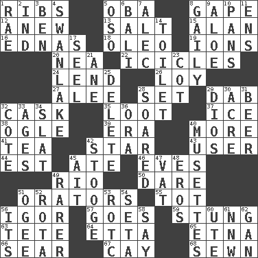 ACROSS 1. Teases 5. Chief or king in Benin or Nigeria 8. Yawn 12. Afresh 13. Table seasoning 15. ____ Jay Lerner 16. Ferber et al. 18. Margarine 19. Charged particles 20. Teachers' org. 22. Winter's stalactites 24. Grant temporary use of 26. Myrna of the movies 27. Toward shelter 28. Arrange properly for use 29. Apply (a substance) by light strokes 32. Keg 35. Spoils 37. Frozen water 38. Stare at amorously 39. Period 40. Greater amount 41. Beverage made from leaves 42. Play the lead 43. One who uses or employs something 44. Eastern Standard Time (abbr.) 45. Had dinner 46. Nights before holidays 49. _ de Janeiro 50. Have the gumption 51. Speakers 55. Small child 56. Composer Stravinsky 57. Leaves 59. Feeling sharp psychological pain 63. Wig 64. Singer James 65. Inactive volcano in Sicily 66. Burn superficially 67. Island 68. Stitched DOWN 1. Actress Charlotte 2. Working for oneself (abbr.) 3. Benjamin's nick name 4. Tchaikovsky ballet 5. Bear (Spanish) 6. Indonesian resort city 7. Actor Baldwin 8. Lightheartedly 9. _ vera 10. Baking dishes 11. Followers of ems 14. Bathroom plumbing fixture 17. Sew up the eyelids of hawks and falcons 21. One (Scot) 23. Small bed 25. Keyboard key 28. Flew 29. "Vaya con ____" 30. 43,560 square feet 31. Fermented drink made from hops 32. ____ d'Azur (French Riviera) 33. Ripens 34. Narrow board 36. Mouth or opening 40. French bagpipes 42. Moe Howard, for one 45. Small island 47. Large container 48. Greek god of love 49. More valued for its uncommonness 51. Double curve, resembling the letter S 52. Round or rotation of duties 53. College mil. group 54. Stalk of a moss capsule 56. It is 58. Declare 60. Shoshoni 61. Compass dir. 62. Separate the seeds from cotton