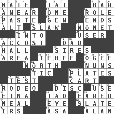 ACROSS 1. Nathan's nickname 5. Make lace 8. Long, evenly shaped piece 11. Approach 13. Single 14. Hero or heavy, e.g. 15. Thick mixture 16. Commissioned military rank (abbr.) 17. Extremities 18. Keyboard modifier key 19. Cole _ (cabbage dish) 21. Music written for nine 22. To the inside or interior of 24. One who uses or employs something 25. Buttonhole 27. June honoree 29. Shopping center 30. Male parents of animals 32. Length times width 33. Giggle 35. Double curve, resembling the letter S 39. Compass direction 41. Religious women 42. Nervous spasm 43. Food holders 45. Trial 48. Haul 49. Cowboy competition 50. Compact _ 52. Purpose 55. Inactive volcano in Sicily 56. Small boy 57. Having ears or earlike features 59. Actress Patricia 60. Sight organ 61. Schedule 62. Big collection agency 63. White ___ sheet 64. Actor Alda or Thicke DOWN 1. California wine valley 2. Of or related to the anus 3. A testis 4. Consume 5. Ancient Roman robe 6. Afresh 7. Nine, plus one 8. Child's nurse 9. Tree or shrub in the Birch family 10. Repose 12. Musical pauses 14. Vintage cars 20. Car dealer's back yard 21. Unadorned 23. Pitcher Ryan 25. Nanny (var.) 26. Auto 27. Expire 28. "We ___ not amused" (Victoria) 30. Quiet! 31. Underwater navigation system 33. Three (prefix) 34. And so on (abbr.) 36. From the throat 37. Compass dir. 38. Curvy letter 40. Von Bismarck 43. Personal Computers (abbr.) 44. Shoestrings 45. Carrier 46. Ferber et al. 47. Lick closed 49. Painter Guido (1575-1642) 50. 24-hour periods 51. It may be bright or harebrained 53. Bristle 54. Locale of original sin 56. Afternoon social gathering 58. Wing
