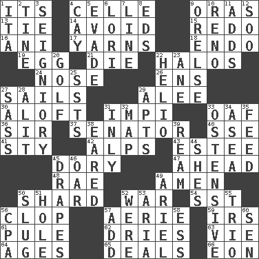 ACROSS 1. ___ a Wonderful Life 4. Cell (Danish) 9. Mouths or openings 13. Neckwear 14. Keep away from 15. Make new 16. Black tropical American cuckoo 17. Tall tales 18. Inside; within (prefix) 19. Oval reproductive body of a fowl 21. Expire 22. Saint headwear 24. Olfactory organ 26. Followers of ems 27. Moves on water 29. Toward shelter 30. High up in or into the air 31. Body of Kaffir warriors 33. Clumsy lout 36. Title for a knight 37. Legislator 40. Compass dir. 41. Filthy place 42. High mountains 43. First name in cosmetics 45. Small, narrow, flatbottom fishing boat 47. Forward in time 48. Actress Charlotte 49. So be it 50. Pottery fragment 52. Armed conflict 54. Fast jet (abbr.) 56. Hoof sound 57. Nest on high 59. Big collection agency 61. Whine 62. Frees from moisture 63. Compete 64. Eons 65. Allots cards 66. Period of immesurable duration DOWN 1. Call ___ day 2. Prong on a fork 3. Signiory (variant) 4. Island 5. Elude 6. Australian parrot (variant) 7. Actor's bit 8. Begley and Asner 9. Threatening words 10. Western Nevada city 11. Does sums 12. "Barney Miller" actor Jack 20. _ course 22. Sun: prefix 23. A saturated hydrocarbon 25. Fast planes 27. Backtalk 28. Set down 29. Flats, for short 31. Inwardly 32. Atlas unit 33. Clearly or manifestly demonstrative 34. Toward the sea 35. Nourish 38. Having ears or earlike features 39. 480, 500 or 516 sheets of paper 44. "______ My Girl" (Turtles hit) 45. Window treatments 46. Rowing implement 49. Satellite of Uranus 50. A hard, heavy blow 51. Hollow 52. We are 53. Roberta Peters solo 55. Musical group of three 56. Numbers guy (abbr.) 57. Increase 58. Curvy letter 60. Elected rep.