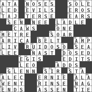 ACROSS 1. "One Day ___ Time" 4. Olfactory organs 9. Not divided or shared with others 13. Directed 14. Vices 15. Greek god of love 16. _ Mahal 17. Laconic 18. Hearing organs 19. Elected rep. 21. Born 22. Dipping utensil 24. Crow sounds 26. Single 27. Distance measurement (Brit.) 29. Fly high 30. N. Chile seaport 31. Waist strap 33. Electrical Unit 36. 54 in ancient Rome 37. Boisterous (Brazilian Portuguese) 40. Ocean 41. Area sheltered from the wind 42. Political cartoonist Thomas 43. Administered medicine 45. The front part of a cuirass 47. Proofreads 48. Lion 49. Sums up 50. American astronaut and politician John 52. Title for a knight 54. R.R. building 56. Actor Baldwin 57. Bert's buddy 59. In the manner of 61. Gone 62. Wash lightly 63. Tired old horse 64. Conclusions 65. NE Netherlands city 66. Neckwear DOWN 1. The first octave above the treble staff 2. Afternoon social gatherings 3. Descriptive word 4. Fish or hair follower 5. Baking chambers 6. Beget 7. Otherwise 8. Compass dir. 9. Sowing specialist 10. Spoken 11. Old wives' tales, e.g. 12. Double-curved letter 20. Drug cop 22. Plunders 23. Santa ___, CA 25. Put on (as clothing) 27. Promenade 28. One of the Great Lakes 29. Groove 31. Prejudice 32. Begley and Asner 33. Helper 34. Rendezvous 35. Writing tablets 38. The state of being joined or united 39. Wrote a lyric poem 44. Probability 45. Chooses 46. Commissioned mil. rank 49. Originate 50. Small, secluded valley 51. Grant temporary use of 52. Indian titles of respect 53. Taverns 55. Jai _ 56. Deep reverence 57. Period 58. Car or cant ending 60. Ripen