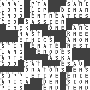 ACROSS 1. Of or related to the anus 5. Parent Teacher Association (abbr.) 8. Indian skirt 12. Old wives' tales, e.g. 13. Mouth edge 14. Middle Eastern gold or silver currency 15. Inside; within (prefix) 16. Pleas 19. Corporate head (abbr.) 20. More lively and spirited 21. Long journey 23. Single 24. Curve 27. Vertical spar for supporting sails 30. Leg joint 31. Moral principles 34. Soon (poet.) 35. Use a swizzle stick 38. Related on the mother's side 40. Egg locale 41. Long (Scottish) 42. Eats (away) 44. Johnson of "Laugh-In" 45. "____ silly question..." 46. Thick or sticky substance 47. Feline 50. Son of Isaac 53. Speakers 57. Followers of ems 59. Supplying deficiencies 63. One of the Great Lakes 64. N. Chile seaport 65. Lair 66. The Jewish people; Israel 67. Sliced desserts 68. Conclude 69. Watch over DOWN 1. Actor Baldwin 2. Music written for nine 3. Zeal 4. Lion 5. Entreaty 6. Canisters 7. Tenement units (abbr.) 8. Be seated 9. Cuckoo 10. Actress Charlotte 11. Big collection agency 14. Have the gumption 17. _ de Janeiro 18. Car or cant ending 20. Three-handed card game 22. Develop 24. Singer Murray 25. Vintage cars 26. Penny 28. A female animal or person 29. Prong on a fork 30. Sunflower state 32. Automobile 33. Portico 35. Volcanic refuse 36. Edible starchy tuberous root 37. To the inside or interior of 39. Begley and Asner 43. Makes supply last 47. Root beer relative 48. "We ___ not amused" (Victoria) 49. Make lace 51. Nest on high 52. The state of being joined or united 54. Event that recurs at intervals 55. Baking chamber 56. Tear apart 58. Post 59. Plant excrement 60. RI univ. 61. Sliced dessert 62. Personal Computers (abbr.) 63. Eastern Standard Time (abbr.)