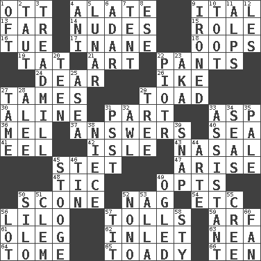 ACROSS 1. Baseball player Mel 4. Having winglike extensions 9. Slanted text style (abbr.) 13. At a great distance 14. Unclothed pictures 15. Hero or heavy, e.g. 16. Third day of the wk. 17. Silly 18. I made a mistake 19. Make lace 21. Tate display 22. Leg coverings 24. Letter starter 26. D.D.E's nickname 27. Corrects by punishment or discipline 29. Frog relative 30. Place in a line 31. Piece 33. Viper 36. Cartoonist voice _ Blanc 37. Responses 40. Ocean 41. Snakelike fish 42. Capri or Wight 43. Rhinal 45. Proofreading order 47. Originate 48. Nervous spasm 49. Elects 50. Biscuitlike quick bread 52. Tired old horse 54. And so on (abbr.) 56. _ and Stitch 57. For Whom the Bell _____ 59. Sandy's bark 61. Cassini of fashion 62. An arm off of a larger body of water 63. Teachers' org. 64. Heavy book 65. Sycophant 66. Nine, plus one DOWN 1. Often (poetically) 2. Tense 3. Excercise machine 4. Black tropical American cuckoo 5. Type of eclipse 6. The sixth month of the Jewish calendar 7. Portable shelter 8. Compass dir. 9. Pressed 10. A blast of a horn 11. High mountains 12. French article 20. Adolescent 22. Peter (Polish) 23. Alias (abbr.) 25. Toward the sea 27. Not wild 28. Toward shelter 29. Family _ (genealogy) 31. Inconspicuous attention getter 32. Leather borer 33. Helper 34. Oceans 35. Light colored 38. Sibling's daughter 39. Fastener 44. Johnson of "Laugh-In" 45. Moe Howard, for one 46. Metal container 49. Stared 50. Grain storage tower 51. Clement's nick name 52. Words to Nanette 53. Silent film actress Nazimova 55. Algonquian 56. Car dealer's back yard 57. Teat (slang) 58. Filthy place 60. Avid follower