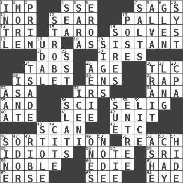 ACROSS 1. Mischievous child 4. Compass dir. 7. Droops 11. And not 12. Scorch 13. Chummy 14. Three (prefix) 15. Edible starchy tuberous root 16. Finds the solution 17. Arboreal primate 19. Aide 21. Two (Sp.) 23. Angers 24. Bar bills 25. Grow older 26. Affectionate concern, for short 29. Small island 30. Followers of ems 31. Hit sharply and swiftly 32. White ___ sheet 33. Big collection agency 34. Santa ___, CA 35. Plus 36. _-fi 37. Former Milwaukee Brewers owner Bud 40. Had dinner 41. Area sheltered from the wind 42. A single undivided whole 43. Glance over 45. And so on (abbr.) 46. Conclusion 51. Arrive at 55. Foolish or stupid persons 56. Musical sound 58. _ Lanka 59. Impressive in appearance 60. Singer Brickell 61. Possessed 62. Celtic language 63. Perceive with the eye 64. Sight organ DOWN 1. International (abbr.) 2. Greater amount 3. Demure 4. Ocean 5. "Two Mules for Sister ____" 6. Greek god of love 7. Table seasonings 8. Inventor's middle name 9. Small, secluded valley 10. System (abbr.) 12. Disco prop 13. Introduce or present, as a question 16. Titles for men of rank and authority 18. Hereditary estate 20. Signals 22. Fast jet (abbr.) 24. Sadhe (variant) 25. Nest on high 26. Distinguishing feature 27. Austrian-born American filmmaker Fritz 28. Tax preparer (abbr.) 29. Is not 32. American Automobile Association (abbr.) 33. Ancient Celtic tribe of eastern Britain 36. Narrow boards 37. Institute legal proceedings 38. Main course 39. Louse (plural) 43. Fur scarf 44. Quote 46. Trig term 47. Scent 48. Chest bones 49. Singles 50. Connecting point 52. American tennis player Robert 53. Supercomputer manufacturer 54. Flintstone garb 57. Neckwear