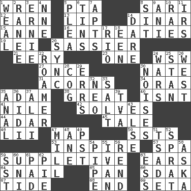 ACROSS 1. Songbird 5. Parent Teacher Association (abbr.) 8. Indian skirt 12. Merit 13. Mouth edge 14. Middle Eastern gold or silver currency 15. Queen of England 1702-14 16. Pleas 19. Flowery wreath 20. More impudent 21. Suggestive of the supernatural 23. Single 24. Compass dir. 27. At one time in the past 30. Nathan's nickname 31. Oak nuts 34. Mouths or openings 35. First of billions? 38. Relatively large 40. Is not 41. Mediterranean tributary 42. Finds the solution 44. The sixth month of the Jewish calendar 45. Falsehood 46. Cards in a Roman deck? 47. Atlas unit 50. Fast planes 53. Heighten or intensify 57. Health resort 59. Supplying deficiencies 63. Hearing organs 64. Slow-paced one 65. Baking dish 66. Neighbor of Neb. 67. Periodic rise and fall of the sea level 68. Conclude 69. Bristle DOWN 1. Welt 2. The wife of a rajah (variant) 3. Bert's buddy 4. Compass dir. 5. Entreaty 6. Airtight sealed metal containers 7. Tenement units (abbr.) 8. Be seated 9. Black tropical American cuckoo 10. Actress Charlotte 11. Big collection agency 14. Have the gumption 17. _ de Janeiro 18. Car or cant ending 20. Synchronize (abbr.) 22. Wanderer 24. Armed conflicts 25. Comedian Laurel of Laurel & Hardy 26. 270 degrees 28. Gear tooth 29. Blunders 30. Annoying sounds 32. Modern: prefix 33. Table seasoning 35. Of or related to the anus 36. "You Light Up My Life" star Conn 37. Jai _ 39. Federal power corp. 43. Otherwise 47. Place where flour is made 48. One (Scot) 49. Pacific Standard Time (abbr.) 51. Sadhe (variant) 52. Small fatty European fish 54. Corncob 55. "Terrible" tsar 56. Tear apart 58. "____ silly question..." 59. Fast jet (abbr.) 60. Single; one (prefix) 61. Writing tablet 62. Sliced dessert 63. Curvy letter