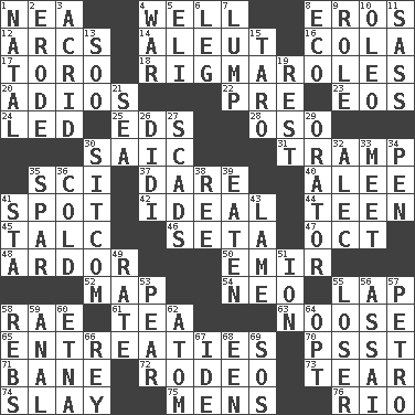 ACROSS 1. Teachers' org. 4. Not ill 8. Greek god of love 12. Curves 14. Eskimo relative 16. Root beer relative 17. "Corrida" creature 18. Complicated, petty procedures 20. Goodbye (Sp.) 22. Before (prefix) 23. Greek goddess of the dawn 24. Directed 25. Begley and Asner 28. Bear (Spanish) 30. Ketch in the Levant 31. _____ steamer (cargo ship) 35. _-fi 37. Have the gumption 40. Toward shelter 41. Blemish 42. Perfect 44. Adolescent 45. Baby powder 46. Bristle 47. Sep. follower 48. Zeal 50. Independent ruler or chieftain 52. Atlas unit 54. Modern: prefix 55. Pet locale 58. Actress Charlotte 61. Afternoon social gathering 63. Trap for birds or small mammals 65. Pleas 70. Inconspicuous attention getter 71. Object of repulsion 72. Cowboy competition 73. Separate forcefully 74. Kill 75. Not women's 76. River (Sp.) DOWN 1. Relating to or accompanying birth 2. Eat (away) 3. Bitter 4. Armed conflict 5. Biblical high priest 6. Part of a journey 7. Mass 8. Environmental prefix 9. Hero or heavy, e.g. 10. Margarine 11. Backtalk 13. "Barney Miller" actor Jack 15. Pacific island yam 19. State of inaction 21. Ocean 26. "You Light Up My Life" star Conn 27. Heaps 29. Speaker 30. "Cheers" or "Ellen" 32. Actor Baldwin 33. Confront 34. Animal enclosure 35. Practice fight 36. Lacking warmth 38. To separate or throw off 39. Ingested 41. R.R. building 43. Unable to walk 49. Pace 51. Electrically charged atom 53. Lightbulb-shaped fruit 55. Failure 56. Slender Brazilian palm 57. Stone: prefix 58. Confederate soldiers (slang) 59. Of or related to the anus 60. Inactive volcano in Sicily 62. Smallest unit of an element 64. Choose 66. Marina Del _, California 67. Binary compound 68. Car or cant ending 69. Distress signal
