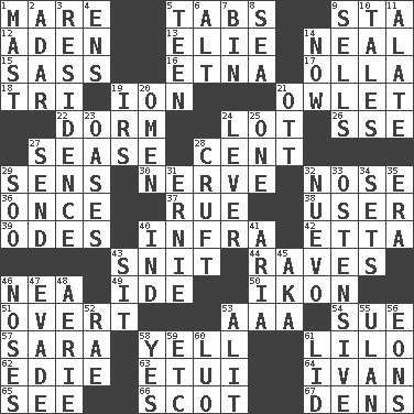 ACROSS 1. Female horse 5. Bar bills 9. R.R. building 12. Arabian gulf 13. Writer Wiesel 14. Be tempered by heat 15. Backtalk 16. Inactive volcano in Sicily 17. Spanish pot 18. Three (prefix) 19. Electrically charged atom 21. A small or young owl 22. Dormintory (informal) 24. Car dealer's back yard 26. Compass dir. 27. Gospel singer Marvin 28. Penny 29. Elected reps. 30. Boldness 32. Characteristic smell of wine 36. At one time in the past 37. Regret 38. One who makes use of a thing 39. Lyric poems 40. Kind of red light 42. Singer James 43. In a ____ (agitated or irritated) 44. All-night dance parties 46. Teachers' org. 49. Binary compound 50. Picture 51. Unconcealed 53. Auto club (abbr.) 54. Take to court 57. "Two Mules for Sister ____" 58. Shout 61. _ and Stitch 62. Singer Brickell 63. Needle case 64. _ the terrible 65. Perceive with the eye 66. Native of Scotland 67. Hiding places for outlaws DOWN 1. Vertical spar for supporting sails 2. The sixth month of the Jewish calendar 3. Dwelling 4. Followers of ems 5. Adolescent 6. Keyboard modifier key 7. Storage container 8. Ocean 9. Makes a sale 10. Falsehoods 11. Having winglike extensions 14. At this time 19. Big collection agency 20. Sign of something about to happen 21. Baseball player Mel 23. Fertile tracts in a desert 24. Prying instrument 25. Single 27. Post 28. An unpleasant substance 29. "Barney Miller" actor Jack 31. Bert's buddy 32. New (sp.) 33. Clearly or manifestly demonstrative 34. Arranges properly for use 35. Period 40. Working for oneself (abbr.) 41. Roberta Peters solo 43. Be seated 45. Alias (abbr.) 46. Olfactory organs 47. Elude 48. Nest on high 52. Actress Charlotte 53. Set down 55. ____ Bator 56. Immeasurably long periods of time 58. Affirmative reply 59. And so on (abbr.) 60. Nilotic language 61. Hat (slang)