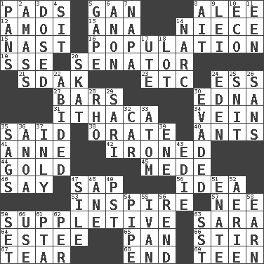 ACROSS 1. Writing tablets 5. Separate the seeds from cotton 8. Toward shelter 12. Mine, in Marseilles 13. Santa ___, CA 14. Sibling's daughter 15. Political cartoonist Thomas 16. Census information 19. Compass dir. 20. Legislator 21. Neighbor of Neb. 23. And so on (abbr.) 24. Double-curved letter 27. Long, evenly shaped pieces 30. Pulitzer Prize-winning author Ferber 31. New York city 34. Distinctive style or manner 35. Stated 38. Declaim 40. Pismires 41. Queen of England 1702-14 42. Pressed 44. Precious metal 45. Ancient Persian 46. Declare 47. Plant excrement 50. It may be bright or harebrained 53. Heighten or intensify 57. Born 59. Supplementary 63. "Two Mules for Sister ____" 64. First name in cosmetics 65. Baking dish 66. Use a spoon 67. Rend 68. Conclude 69. Adolescent DOWN 1. Baking dishes 2. Collect or gather 3. Administered medicine 4. Be seated 5. Stare wonderingly 6. At once, immediately (arch.) 7. California wine valley 8. Small island 9. Luau accessory 10. Environmental prefix 11. Car or cant ending 14. Drug cop 17. Shoshoni 18. Car dealer's back yard 20. Three-handed card game 22. Stayed 24. Locale of original sin 25. In a ____ (agitated or irritated) 26. Without 28. 17th letter of the Greek alphabet 29. Indian skirt 30. Dodged 32. 4-wheeled motor vehicle 33. Smallest unit of an element 35. Droops 36. Small Philippine buffalo 37. Inwardly 39. Compass dir. 43. Singer Brickell 47. Drop; flow; fall 48. One (Scot) 49. Pacific Standard Time (abbr.) 51. Maternal 52. Nest on high 54. Corncob 55. "Terrible" tsar 56. Tear apart 58. Merit 59. Arrange properly for use 60. Purpose 61. Parent Teacher Assoc. 62. For each 63. Fast jet (abbr.)
