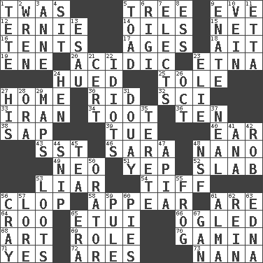ACROSS 1. It was, poetically 5. Relationship diagram 9. First lady 12. Bert's buddy 14. Lubricates 15. Remaining after all deductions 16. Portable shelters 17. Matures 18. Small island 19. Compass dir. 20. Being or containing an acid 23. Inactive volcano in Sicily 24. Took on color 25. Lacquered or enameled metalware 27. Dwelling 30. To free from 32. _-fi 33. SW Asia republic 34. A blast of a horn 36. Nine, plus one 38. Plant excrement 39. Third day of the wk. 40. Hearing organ 43. Fast jet (abbr.) 46. "Two Mules for Sister ____" 48. Billionth: prefix 49. Modern: prefix 51. Slangy assent 52. Thick slice 53. One who doesn't tell the truth 54. Small quarrel 56. Hoof sound 58. Seem 61. "We ___ not amused" (Victoria) 64. Friend of Pooh 65. Needle case 66. Stared at amorously 68. Tate display 69. Hero or heavy, e.g. 70. Street urchin 71. It is so 72. Ancient Greek god of war 73. Grandmother DOWN 1. False hair 2. Songbird 3. Singer Murray 4. Be seated 5. Frog relative 6. Swiss mountan, "Queen of the Mountains" 7. Opts 8. Curvy letter 9. Maternal 10. Distinctive style or manner 11. Singer James 13. Son of Isaac 21. Sure thing 22. Foolish or stupid persons 23. Writer Wiesel 24. Layer 26. Sep. follower 27. Part of HMS, perhaps 28. Mouth or opening 29. Atlas contents 31. A city in N France, SE of Calais 35. Cylindrical with tapered ends 37. Be tempered by heat 41. Santa ___, CA 42. Director Reiner 44. Clip 45. Beverage made from leaves 47. Capital of Western Samoa 48. Science/research agcy. 50. Speaker 53. Plunders 55. Toadlike animal 56. Supercomputer manufacturer 57. Old wives' tales, e.g. 59. Whine 60. Sliced desserts 61. _ mater 62. It's straight from the horse's mouth 63. Pulitzer Prize-winning author Ferber 65. Epoch 67. Separate the seeds from cotton