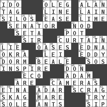 ACROSS 1. Wedding promise 4. Cassini of fashion 8. Actor Alda or Thicke 12. Label 13. Actor's bit 14. (Had) reclined 15. Grain storage towers 18. Comfort 19. Citrus frut 20. Elected representative 22. Lower and raise head in agreement 23. Stalk of a moss capsule 24. Cooking vessel 25. Title for a knight 26. Window treatment 30. Whopper 33. Fertile tracts in a desert 36. Pulitzer Prize-winning author Ferber 37. Gumbo ingredient 39. Luau accessory 40. Whirlpool 41. Dormintory (informal) 42. Calif. Air Force Base 44. Distress signal 45. Stimulate to action 47. Spanish title 50. Environmental prefix 51. First man 53. "We ___ not amused" (Victoria) 54. Devices for capturing images 57. Inactive volcano in Sicily 59. The sixth month of the Jewish calendar 61. Lean end of the neck 63. Heroin 64. Female horse 65. Attempt to accomplish something 66. Not divided or shared with others 67. Pismires 68. Small drink DOWN 1. ___ a Wonderful Life 2. Raised platform 3. Stares 4. Butter sub 5. One who doesn't tell the truth 6. Followers of ems 7. Turn to the right 8. One to whom something is allotted 9. Put down 10. Direct toward a target or goal 11. Compass dir. 16. Washington bills 17. Suttee (variant) 21. Pacific island yam 22. And not 24. Product of festering 26. To provide with a ceiling 27. Does sums 28. _ china 29. Negative votes 30. Farming town in central California 31. Picture 32. Blunders 34. Toward shelter 35. Ocean 38. Electrical Measurement 42. Sis' sibling 43. Dutch treat 46. Frozen water 48. Lyric poems 49. Drug cop 52. Shops 53. Of or related to the anus 54. Draw slowly or heavily 55. Ancient Greek god of war 56. Indian skirt 57. Double-curved letter 58. Ring climax 59. Nursemaid (var.) 60. Daniel's nick name 62. Hustle