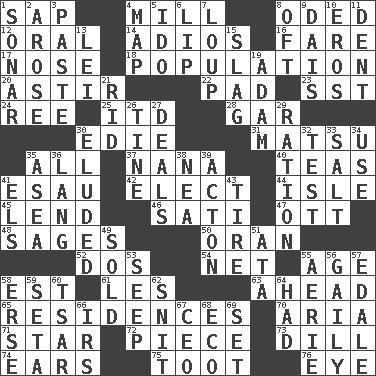 ACROSS 1. Plant excrement 4. Place where flour is made 8. Wrote a lyric poem 12. Of the mouth 14. Goodbye (Sp.) 16. Conductor's collection 17. Characteristic smell of wine 18. Census information 20. Moving about 22. Groovy apt. 23. Fast jet (abbr.) 24. Portuguese money of account (variant) 25. It would 28. Slender fish 30. Singer Brickell 31. Taiwanese island in East China Sea 35. Everything 37. Grandmother 40. Afternoon social gatherings 41. Son of Isaac 42. Voters do this 44. Small island 45. Grant temporary use of 46. Suttee (variant) 47. Baseball player Mel 48. Gurus 50. NW Algerian seaport 52. Two (Sp.) 54. Fish or hair follower 55. Ripen 58. Eastern Standard Time (abbr.) 61. French article 63. Toward the future 65. Homes 70. Operatic vocal solo 71. Play the lead 72. Component 73. Deli pickle 74. Hearing organs 75. A blast of a horn 76. Sight organ DOWN 1. Echolocation 2. Came up 3. Thick mixture 4. Atlas unit 5. Wedding promise 6. Mouth edge 7. Central Nebraska county 8. Often (poetically) 9. Raised platform 10. Greek god of love 11. Gouge 13. Luau accessory 15. Volcanic refuse 19. First of billions? 21. To free from 26. Prong on a fork 27. Allots cards 29. Food allowance for one day 30. Dodged 32. Trial 33. Table seasoning 34. Purpose 35. At sea 36. Austrian-born American filmmaker Fritz 38. Teachers' org. 39. Gambison 41. Raised railways 43. Become fatigued 49. Exchanged or delivered for money 51. _ moment's notice (2 wds.) 53. Ooze 55. Nest on high 56. Lightheartedly 57. Peak District village in England 58. Celtic language 59. Bristle 60. Russian ruler of old 62. In a ____ (agitated or irritated) 64. Possessed 66. Big collection agency 67. Corporate head (abbr.) 68. Environmental prefix 69. Arrange properly for use