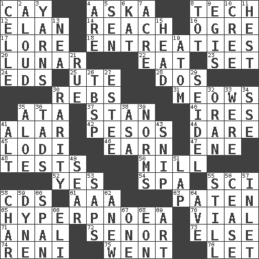 ACROSS 1. Island 4. "____ silly question..." 8. Georgia ____ (Atlanta school) 12. Liveliness 14. Arrive at 16. Legendary monster 17. Old wives' tales, e.g. 18. Pleas 20. Type of eclipse 22. Erode 23. Put into a specified state 24. Begley and Asner 25. Shoshoni 28. Two (Sp.) 30. Confederate soldiers (slang) 31. Catcalls? 35. "One Day ___ Time" 37. Comedian Laurel of Laurel & Hardy 40. Angers 41. Having or resembling wings 42. Mexican monetary units 44. Have the gumption 45. Farming town in central California 46. Merit 47. Compass dir. 48. Trials 50. Place where flour is made 52. It is so 54. Health resort 55. _-fi 58. Music discs 61. American Automobile Association (abbr.) 63. Eucharist need 65. Abnormally rapid or deep breathing 70. Small bottle 71. Of or related to the anus 72. Sir (Sp.) 73. Otherwise 74. Painter Guido (1575-1642) 75. Gone 76. Allow DOWN 1. Cell (Danish) 2. Verbally 3. Tall tales 4. "We ___ not amused" (Victoria) 5. Elected rep. 6. Krazy ___ of comics 7. Measure of real estate 8. Small child 9. The front part of a cuirass 10. Algonquian 11. Command 13. Teachers' org. 15. Froth on beer 19. Tiny particle 21. Sorrow 26. Cook's measure (abbr.) 27. First name in cosmetics 29. Beer mug 30. Noteworthy scarcity 32. NW Algerian seaport 33. We are 34. Compass dir. 35. _ vera 36. Small boys 38. White ___ sheet 39. Typical standards 41. Keyboard modifier key 43. Sever or remove by pinching or nipping 49. Singe 51. Pet locale 53. Plant excrements 55. Not moving 56. Desist 57. An arm off of a larger body of water 58. Burn to charcoal 59. Unit of force 60. Connect, as a bridge 62. Afresh 64. "___ Maria" 66. Biblical high priest 67. Single 68. A really long time 69. Tate display