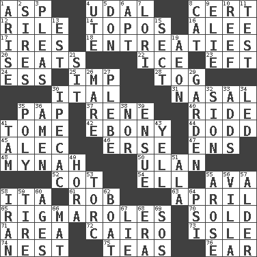 ACROSS 1. Viper 4. Allodial 8. Foregone conclusion 12. Cause heat under the collar 14. Literary convention 16. Toward shelter 17. Angers 18. Pleas 20. Theater features 22. Frozen water 23. Lizard (obsolete) 24. Double-curved letter 25. Naughty child 28. Coat; cloak 30. Slanted text style (abbr.) 31. Rhinal 35. Infant food 37. French philosopher Descartes 40. Travel on an animal 41. Heavy book 42. Black 44. Texas town _ City 45. Actor Baldwin 46. Celtic language 47. Followers of ems 48. Non-adult bird? 50. ____ Bator, Mongolia 52. Small bed 54. Pipe bend 55. Actress Gardner 58. Call ___ day 61. Director Reiner 63. Showery time 65. Complicated, petty procedures 70. Disposed of to a purchaser 71. Type of rug 72. Capital of Egypt 73. Capri or Wight 74. A home for chicks 75. Afternoon social gatherings 76. Hearing organ DOWN 1. Get up 2. Begets 3. Entreaties 4. Shoshoni 5. Spanish title 6. Fitting 7. Australian parrot (variant) 8. Feline 9. Writer Wiesel 10. Coral ridge 11. Trial 13. Eastern Standard Time (abbr.) 15. Religious group 19. A really long time 21. Be seated 26. Female horse 27. Military trainee 29. Place where plants grow 30. Medicinal drug used to evoke vomiting 32. The Jewish people; Israel 33. Does sums 34. Directed 35. Much (prefix) 36. So be it 38. And not 39. Take place subsequently 41. Scottish cap 43. Shout 49. Israeli folk dance 51. Insect wing 53. Torque (variant) 55. Came up 56. Country estate 57. Tree or shrub in the Birch family 58. SW Asia republic 59. Hoop that covers a wheel 60. Eons 62. Water vessel 64. Air pressure measure (abbr.) 66. Floor protector 67. Falsehood 68. Period 69. Mayday