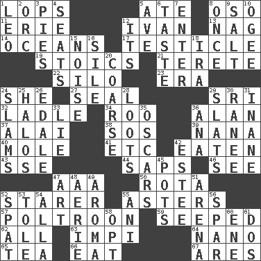 ACROSS 1. Chops off 5. Had dinner 8. Bear (Spanish) 11. One of the Great Lakes 12. _ the terrible 13. Tired old horse 14. Seas 17. One of the two male reproductive glands 19. Unemotional ones 21. Cylindrical with tapered ends 22. Grain storage tower 23. Period 24. A female animal or person 27. Lick closed 29. Indian title of respect (Mr.) 32. Dipping utensil 34. Friend of Pooh 36. ____ Jay Lerner 37. Mountain range southwest of Kyrgyzstan 38. Distress signal 39. Nanny 40. Undercover agent 41. And so on (abbr.) 42. Eroded 43. Compass dir. 44. Plant excrements 46. Perceive with the eye 47. American Automobile Association (abbr.) 50. Roll call or roster of names 52. A viewer who gazes fixedly 55. Michaelmas daisies 57. Characterized by complete cowardliness 59. Oozed 62. Everything 63. Body of Kaffir warriors 64. Billionth: prefix 65. Afternoon social gathering 66. Consume 67. Ancient Greek god of war DOWN 1. Lion 2. The grampus (Milton) 3. Sliced desserts 4. Theater features 5. "___ Maria" 6. Clothes sense 7. Keyboard key 8. Single time 9. Table seasoning 10. Double curve, resembling the letter S 12. ___ a Wonderful Life 15. Annoying sound 16. Filth; sediment 18. Retirement account (abbr.) 20. Rough 24. Hits or strikes with great force 25. Rings 26. Peak District village in England 28. Plunders 29. Narrow boards 30. The wife of a rajah (variant) 31. Silly 33. Whopper 35. Motion picture awards 36. Santa ___, CA 42. First name in cosmetics 45. Plant holders 47. Tate display 48. Nest on high 49. Scent 51. Sports stadium 52. Petty quarrel 53. Lacquered or enameled metalware 54. Silent film actress Nazimova 55. Black tropical American cuckoo 56. Coast Guard woman 58. Elect 60. Compass dir. 61. Two (Sp.)