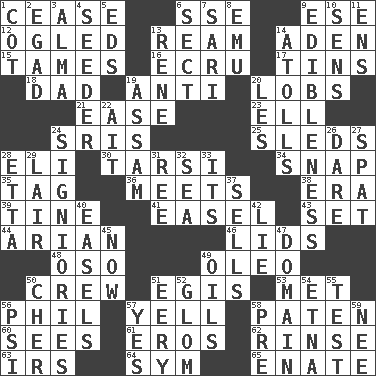 ACROSS 1. Stop 6. Compass dir. 9. Compass dir. 12. Stared 13. 480, 500 or 516 sheets of paper 14. An important port of Yemen 15. Corrects by punishment or discipline 16. Shade of tan 17. Airtight sealed metal containers 18. Male parent 19. Opposed to 20. Tennis shots 21. Comfort 23. Pipe bend 24. Indian titles of respect 25. Bobsleighs 28. Biblical high priest 30. Tarsus (plural) 34. Fastener 35. Label 36. Confronts 38. Epoch 39. Prong on a fork 41. Artist's stand 43. Put into a specified state 44. Believer in; advocate of (suffix) 46. Flaplike coverings 48. Bear (Spanish) 49. Margarine 50. Ship's personnel 51. The front part of a cuirass 53. Was introduced to 56. Silvers or Donahue 57. Shout 58. Eucharist need 60. Perceives with the eye 61. Greek god of love 62. Remove soap 63. Big collection agency 64. Symbol (abbr.) 65. Maternal DOWN 1. Small bed 2. Mild oath 3. _ mater 4. Sowing specialist 5. Begley and Asner 6. Religious group 7. Indian skirt 8. Australian flightless bird 9. The property of being fit to eat 10. Elected reps. 11. Followers of ems 13. French philosopher Descartes 14. Ringlike coral islands and reefs 19. Indian state 20. French article 22. Small island 24. Seigniories (variant) 26. Have the gumption 27. Petty quarrel 28. Singer James 29. Den 31. To riddle 32. Ocean 33. It is 37. Exchanges for money 40. Artist's stands 42. Untruth 45. Immediately 47. Kingdom 49. Lubricates 50. "Mermaids" star 51. Suggestive of the supernatural 52. Seize upon or latch onto something 54. Inactive volcano in Sicily 55. Trial 56. 23rd letter of the Greek alphabet 57. Affirmative reply 58. Before (prefix) 59. Born