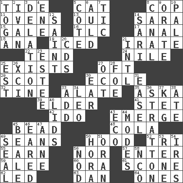 ACROSS 1. Periodic rise and fall of the sea level 5. Feline 8. Police officer (slang) 11. Baking chambers 13. Fr. "Yes" 14. "Two Mules for Sister ____" 15. An organ shaped like a helmet 16. Affectionate concern, for short 17. Of or related to the anus 18. Santa ___, CA 19. On the rocks 21. Feeling or showing extreme anger 22. Be inclined (to) 24. "Death on the ____" 25. Is 27. Often (poetically) 29. Highlander 30. Learning spot: Fr. 32. Prong on a fork 33. Having winglike extensions 35. "____ silly question..." 39. A person who is older than you are 41. Proofreading order 42. Wedding promise 43. Develop 45. Necklace unit 48. Root beer relative 49. Seines 50. Parka part 52. Three (prefix) 55. Merit 56. Not either 57. Keyboard key 59. Toward shelter 60. Mouth or opening 61. Biscuitlike quick bread 62. Directed 63. One of the 12 tribes of Israel 64. Singles DOWN 1. Ancient Roman robe 2. _ the terrible 3. Conveyance 4. Compass dir. 5. ____ d'Azur (French Riviera) 6. Old (Scot.) 7. Nervous spasm 8. Lessep's creation 9. Speak pompously 10. Light colored 12. Virtuous person 14. Indian skirt 20. Music discs 21. International (abbr.) 23. First name in cosmetics 25. Eastern Standard Time (abbr.) 26. One more than ninety 27. Sep. follower 28. Enemy 30. Ewer handle 31. Artist's stand 33. Find the sum of 34. Lion 36. Ski resort town in Vermont 37. Barrel 38. Had dinner 40. Flaplike coverings 43. Environmental prefix 44. Methods 45. Memphis, Tenn. Street 46. Having ears or earlike features 47. Singer Murray 49. Lick closed 50. Israeli folk dance 51. NW Algerian seaport 53. French philosopher Descartes 54. Angers 56. Allow head to fall sleepily 58. Non-commissioned officer (abbr.)