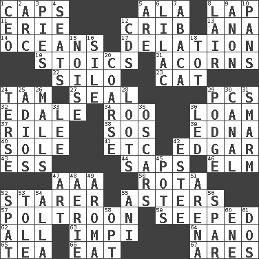 ACROSS 1. Smile enhancers 5. In the manner of 8. Infant locale 11. 4th largest of the Great Lakes 12. Baby bed with high sides 13. Santa ___, CA 14. Seas 17. Accusation by an informer 19. Unemotional ones 21. Oak nuts 22. Grain storage tower 23. Domesticated feline 24. Scottish cap 27. Lick closed 29. Personal Computers (abbr.) 32. Peak District village in England 34. Friend of Pooh 36. Rich soil 37. Cause heat under the collar 38. Mayday 39. Pulitzer Prize-winning author Ferber 40. Not divided or shared with others 41. And so on (abbr.) 42. _ Allan Poe 43. Double-curved letter 44. Plant excrements 46. Shade tree 47. Auto club (abbr.) 50. Round or rotation of duties 52. A viewer who gazes fixedly 55. Michaelmas daisies 57. Coward 59. Oozed 62. Everything 63. Body of Kaffir warriors 64. Billionth: prefix 65. Afternoon social gathering 66. Ingest 67. Ancient Greek god of war DOWN 1. Corporate head (abbr.) 2. Curve 3. Sliced desserts 4. Theater features 5. "We ___ not amused" (Victoria) 6. Pale purple color 7. Phillipine bananalike plant 8. Den 9. At once, immediately (arch.) 10. Baking dishes 12. Music discs 15. Annoying sound 16. Drop; flow; fall 18. Small child 20. Unrefined 24. Laconic 25. Goodbye (Sp.) 26. Shopping centers 28. Plunders 29. Porridge 30. Lessep's creation 31. Excessive but superficial compliments 33. Area sheltered from the wind 35. Motion picture awards 36. Directed 42. First name in cosmetics 45. Cooking vessels 47. Tate display 48. Nest on high 49. Scent 51. Sports stadium 52. Argument over a trivial matter 53. Lacquered or enameled metalware 54. Silent film actress Nazimova 55. Black tropical American cuckoo 56. Practice fight 58. Elect 60. Compass dir. 61. Two (Sp.)
