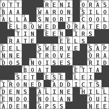 ACROSS 1. Baseball player Mel 4. Painter Guido (1575-1642) 8. Mouths or openings 12. Sound made by sheep 13. Make _____ (do battle with) 14. Grain storage tower 15. Silent film actress Nazimova 17. Derisive sound 18. Calm and collected 19. Shoved, as through a crowd 21. Declaimed 23. Metal container 24. Car or cant ending 26. Big collection agency 27. Pace 28. Snakelike fish 30. Snakelike fish 31. Turn aside suddenly 34. Plant excrement 37. Compass dir. 38. Collection of objects 39. Mouth or opening 40. Two (Sp.) 41. Annoying sounds 42. To free from 43. Water vessel 44. Singer James 46. Arrange properly for use 47. Compass dir. 50. Luau accessory 51. Pressed 54. Inveterate users 57. Lairs 58. Place in a line 60. Land elevation 62. Inside; within (prefix) 63. Pitcher Ryan 64. Fr. "Yes" 65. An important port of Yemen 66. Global Positioning Systems (abbr.) 67. Born DOWN 1. Chief or king in Benin or Nigeria 2. Falsehood 3. Baron Munchausen's specialties 4. Indian princess (variant) 5. Wear away 6. Not either 7. To the inside or interior of 8. Motion picture awards 9. Disturbances 10. _ vera 11. Disposed of to a purchaser 13. Compass dir. 16. "This won't hurt ____!" 20. Single 22. Cause heat under the collar 25. Impudent aggressiveness 27. Western Nevada city 29. Nights before holidays 30. Conclusion 31. Portico 32. Compose 33. Greek goddess of the dawn 34. Conclusion 35. Operatic vocal solo 36. Writing tablet 41. Musical sound 43. Gillaume's butler role 44. Connecticut Ivy Leaguer 45. Georgia ____ (Atlanta school) 46. Message 48. Moves on water 49. Ferber et al. 51. The main thing one is thinking about 52. Tear apart 53. Mild oath, euphamism for damn 55. Lair 56. Turn sharply 59. Trim (branches) 61. Untruth