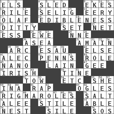 ACROSS 1. Raised railways 4. Downhill vehicle 8. Makes supply last 12. Cause heat under the collar 14. Major League Baseball Commissioner Bud 16. Suggestive of the supernatural 17. Norwegian king 18. The property of being fit to eat 20. Short, simple song 22. Put into a specified state 23. Remaining after all deductions 24. Double-curved letter 25. She-sheep 28. Compass dir. 30. At sea 31. At full speed 35. Curve 37. He sold his birthright 40. Otherwise 41. Actor Baldwin 42. Actor Sean's family 44. Hero or heavy, e.g. 45. Billionth: prefix 46. (Had) reclined 47. Unit of force equal to gravity 48. From or relating to Ireland 50. Prong on a fork 52. Pull behind 54. And so on (abbr.) 55. A female animal or person 58. _ tizzy (2 wds.) 61. Strike 63. Stares 65. Frustrating wastes of time 70. Table seasoning 71. Toward shelter 72. Vertical member of a panel or frame 73. Competent 74. Egg locale 75. Drop; flow; fall 76. Distress signal DOWN 1. Eat (away) 2. Ms. Damita and namesakes 3. Narrow boards 4. Compass dir. 5. Directed 6. Connecticut Ivy Leaguer 7. Rights 8. Car or cant ending 9. Peachy ____! 10. Celtic language 11. System (abbr.) 13. Bank Draft (abbr.) 15. Small, secluded valley 19. Inactive volcano in Sicily 21. Affirmative reply 26. Shed a tear 27. Artist's stand 29. Develop 30. Buttonhole 32. Medicinal plant 33. Small island 34. Born 35. Having or resembling wings 36. Painter Guido (1575-1642) 38. Santa ___, CA 39. Join together 41. Cuckoo 43. In a ____ (agitated or irritated) 49. Israeli folk dance 51. Non-commissioned officer (abbr.) 53. Armed conflicts 55. Broad, flat, thick pieces 56. Phone greeting 57. _____ Park, CO 58. SW Asia republic 59. Mediterranean tributary 60. Matures 62. Cooking vessels 64. Girls' org. (abbr.) 66. Was introduced to 67. Cards in a Roman deck? 68. Pipe bend 69. Observe