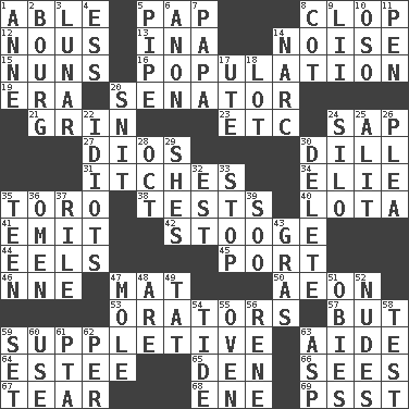 ACROSS 1. Competent 5. Infant food 8. Hoof sound 12. Common sense 13. _ tizzy (2 wds.) 14. Annoying sound 15. Religious women 16. Census information 19. Epoch 20. Legislator 21. Smile widely 23. And so on (abbr.) 24. Plant excrement 27. "Vaya con ____" 30. Deli pickle 31. Strong, restless desires 34. Writer Wiesel 35. "Corrida" creature 38. Trials 40. Globular water bottle used in Asia 41. Send forth 42. Moe Howard, for one 44. Snakelike fish 45. Left side of a ship or aircraft 46. Compass dir. 47. Floor covering 50. A really long time 53. Speakers 57. Yet 59. Supplying deficiencies 63. Helper 64. First name in cosmetics 65. Lair 66. Perceives with the eye 67. Pull into pieces 68. Compass dir. 69. Inconspicuous attention getter DOWN 1. Singer Murray 2. French market town 3. Type of eclipse 4. Double-curved letter 5. Corncob 6. At once, immediately (arch.) 7. Dad 8. Small bed 9. Cards in a Roman deck? 10. Bear (Spanish) 11. Fenced enclosure 14. Drug cop 17. Shoshoni 18. Car dealer's back yard 20. In a ____ (agitated or irritated) 22. Foolish or stupid persons 24. Grain storage tower 25. Came down and settled, as after flight 26. Entreaty 28. Sep. follower 29. "______ My Girl" (Turtles hit) 30. Erase 32. Eastern Standard Time (abbr.) 33. Constrict 35. Adolescent 36. Sign of things to come 37. Cause heat under the collar 39. "Barney Miller" actor Jack 43. Pate de foie ____ 47. Undercover agent 48. "We ___ not amused" (Victoria) 49. Make lace 51. Off-Broadway awards 52. Unadorned figures 54. Event that recurs at intervals 55. Baking chamber 56. French philosopher Descartes 58. Trial 59. Put into a specified state 60. Purpose 61. Parent Teacher Association (abbr.) 62. For each 63. Viper