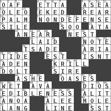 ACROSS 1. Clumsy lout 4. Singer James 8. Toward the sea 12. Margarine 14. Supplemented with great effort 15. Stern 16. Inside of hand 17. Unrelated to defense, as in spending 20. Filth; sediment 21. "Barney Miller" actor Jack 22. _ moment's notice (2 wds.) 23. Approach 27. Egg locale 29. Put down 31. Musical sound 34. Sadhe (variant) 35. Operatic vocal solo 36. Event that recurs at intervals 39. Eastern Standard Time (abbr.) 41. Is not 42. Arabian gulf 43. The principal food of baleen whales 46. Dunce 47. The founder of a family 48. American tennis player Robert 51. Fertile tracts in a desert 54. Soggy 56. Actress Gardner 58. "Vaya con ____" 61. The property of being fit to eat 66. Came down and settled, as after flight 67. Small Philippine buffalo 68. Toward shelter 69. Undercover agent 70. Long (Scottish) 71. Actor's bit 72. Fast jet (abbr.) DOWN 1. I made a mistake 2. Jai _ 3. Man or boy (slang) 4. Car or cant ending 5. Ring climax 6. "___ Little Indians" 7. Sums up 8. "We ___ not amused" (Victoria) 9. Legislators 10. 90 degrees 11. Length times width 13. Sign of something about to happen 18. A really long time 19. Enemy 24. Raised railways 25. American Automobile Association (abbr.) 26. Travel on an animal 28. Slow-paced one 30. Writing tables 32. Shallow baking pan 33. Erode 34. Portable shelters 36. Small boy 37. Wedding promise 38. Conveyance 40. Musical group of three 44. Lyricist Gershwin 45. French article 49. Actor Linden 50. Night before a holiday 52. Dutch treat 53. Grain storage towers 54. Welt 55. Pulitzer Prize-winning author Ferber 57. Of or related to the anus 59. Lubricates 60. Proofreading order 62. Paper or plastic container 63. Biblical high priest 64. Elected rep. 65. Observe