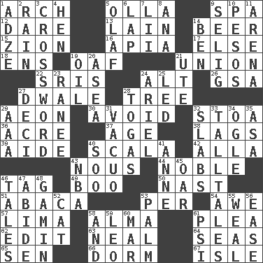 ACROSS 1. Bowlike part 5. Rounded earthenware pot or jar 9. Health resort 12. Have the gumption 13. (Had) reclined 14. Fermented drink made from hops 15. The Jewish people; Israel 16. Capital of Western Samoa 17. Otherwise 18. Followers of ems 19. Clumsy lout 21. The state of being joined or united 22. Indian titles of respect 24. The first octave above the treble staff 26. Girls' org. (abbr.) 27. A sleeping potion; an opiate (poet.) 28. Woody plant 29. Period of immesurable duration 30. Stay clear from 32. Portico 36. 1/640 square mile 37. Grow older 38. Fails to keep up a pace 39. Helper 40. Any of the three canals of the cochlea 42. Silent film actress Nazimova 43. Horse sense 44. Impressive in appearance 46. Label 49. Sometimes accompanies a hiss 50. Political cartoonist Thomas 51. Phillipine bananalike plant 53. For each 54. Deep reverence 57. Pale green bean 58. _ mater 61. Entreaty 62. Prepare for publication 63. Be tempered by heat 64. Oceans 65. Elected rep. 66. Dormintory (informal) 67. Small island DOWN 1. Edge tool used to cut and shape wood 2. Water falling in drops from the sky 3. What you're doing now 4. Layer 5. Norwegian king 6. Infant locale 7. Cards in a Roman deck? 8. Santa ___, CA 9. Former Milwaukee Brewers owner Bud 10. Mexican monetary units 11. Sports stadium 14. Benjamin's nick name 19. Petroleum 20. At sea 21. Shoshoni 23. The wife of a rajah (variant) 24. Satellite of Uranus 25. Directed 27. Tenth: prefix 28. Ancient Roman robes 29. American Automobile Association (abbr.) 31. In a vacuum (with "in") 32. Thick slices 33. Baron Munchausen's specialties 34. Stare 35. White ___ sheet 40. "Barney Miller" actor Jack 41. Queen of England 1702-14 43. Basketball assoc. 45. Boat paddle 46. Falsehoods 47. Remain 48. Homeless child 52. Domesticated feline 53. Inside of hand 55. Welt 56. Comfort 58. Plus 59. Lion 60. Third mo. 61. Air pressure measure (abbr.)