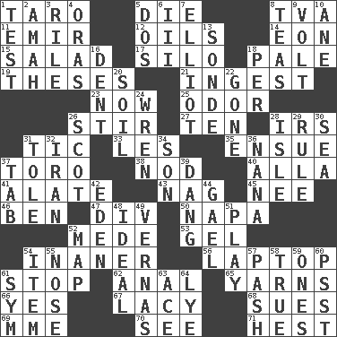 ACROSS 1. Pacific island yam 5. Expire 8. Federal power corp. 11. Arab leader 12. Petroleums 14. Period of immesurable duration 15. Vegetable dish 17. Grain storage tower 18. Light colored 19. College papers 21. Eat 23. At this time 25. Aroma 26. Agitate 27. Nine, plus one 28. Big collection agency 31. Nervous spasm 33. French article 35. Take place subsequently 37. "Corrida" creature 38. Lower and raise head in agreement 40. Silent film actress Nazimova 41. Having winglike extensions 43. Tired old horse 45. Born 46. Benjamin's nick name 47. HTML Container Element 50. California wine valley 52. Ancient Persian 53. Set 54. More lacking in sense or substance 56. Portable computer 61. Close up, plug up 62. Of or related to the anus 65. Entertaining tales 66. Affirmative reply 67. Made of lace 68. Takes to court 69. Madame (abbr.) 70. Observe 71. Behest DOWN 1. Trial 2. Housemaid 3. Cause heat under the collar 4. Mouths or openings 5. Two (Sp.) 6. One more than two 7. American author Paul (1891-1958) 8. Afternoon social gatherings 9. Electrical Unit 10. A saturated hydrocarbon 13. Message 16. Gouge 18. For each 20. The visible part of the earth's surface 22. Went 24. Songbird 26. Native of Scotland 28. Small island 29. General guideline 30. Ocean 31. Lacquered or enameled metalware 32. SW Asia republic 34. Manchild 36. Grandmother 37. Keyboard key 39. Mild oath, euphamism for damn 42. Paradise 44. Highlander 48. Standard of perfection 49. Actresses Bloom and Felton 51. Shaw product 52. Atlas unit 54. A distinct part 55. Sense of smell 57. Romantic infatuation 58. Loyal 59. Washington bills 60. Inconspicuous attention getter 61. Symbol (abbr.) 63. Adept person 64. Sodium hydroxide