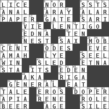 ACROSS 1. Louse (plural) 5. And not 8. Fast planes 12. Of or related to the anus 13. Like ___ of sunshine 15. Having or resembling wings 16. Some stationery 18. Yard entry 19. Indian skirt 20. Compete 22. Small, flat, pigmented spot on the skin 24. Pulitzer Prize-winning author Ferber 26. Nine, plus one 27. Egg locale 28. Saxophone 29. Disorderly crowd 32. Penny 35. Lyric poems 37. Night before a holiday 38. Nursemaid 39. Sodium hydroxide 40. Stitch closed the eyes of (a falcon) 41. Victory 42. Downhill vehicle 43. Inactive volcano in Sicily 44. R.R. building 45. It is 46. Genesis locale 49. Alias (abbr.) 50. Capital of Latvia 51. Commissioned military rank 55. Erode 56. Lie 57. Greek god of love 59. Drug addict 63. Capital of Western Samoa 64. French philosopher Descartes 65. Hero or heavy, e.g. 66. Fermented drink made from hops 67. Grow older 68. Filth; sediment DOWN 1. Infant locale 2. _ tizzy (2 wds.) 3. Head covering 4. Veterans Day date 5. Tired old horse 6. Taken by mouth 7. Assign a rank or rating to 8. Indian antelope 9. Volcanic refuse 10. Pacific island yam 11. Indian title of respect (Mr.) 14. Gossips 17. Travel on or in a vehicle 21. Followers of ems 23. John Ritter's dad 25. Ringlike coral islands and reefs 28. Sowing specialist 29. Rendezvous 30. Baking chamber 31. Actor Lugosi 32. Crow sounds 33. Send forth 34. Grandmother 36. Color 40. Elected representatives 42. A viewer who gazes fixedly 45. D.D.E's nickname 47. Pass on 48. Mild oath 49. Approach 51. Yawn 52. Writer Wiesel 53. Length times width 54. Having great length 56. Keyboard key 58. Perceive with the eye 60. Luau course 61. Pipe bend 62. To separate or throw off