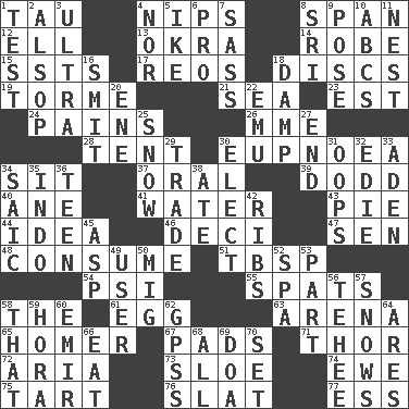 ACROSS 1. The 19th letter of the Greek alphabet 4. Pinches, bites 8. Connect, as a bridge 12. Pipe bend 13. Gumbo ingredient 14. Loose flowing garment 15. Fast planes 17. Vintage cars 18. Plates 19. Singer Mel 21. Ocean 23. Eastern Standard Time (abbr.) 24. Aches 26. Madame (abbr.) 28. Portable shelter 30. Normal relaxed breathing 34. Be seated 37. Of the mouth 39. Texas town _ City 40. A saturated hydrocarbon 41. Wetness 43. Sliced dessert 44. It may be bright or harebrained 46. Tenth: prefix 47. Elected rep. 48. Ingest 51. Cook's measure (abbr.) 54. Air pressure measure (abbr.) 55. Arguments over trivial matters 58. Definite Article 61. Ovum 63. Sports stadium 65. Home run 67. Writing tablets 71. Son of Odin 72. Operatic vocal solo 73. A type of plum 74. She-sheep 75. Small pie 76. Narrow board 77. Double-curved letter DOWN 1. Trial 2. Columnist Joseph or Stewart 3. Extreme 4. Not either 5. Eisenhower's nickname 6. Adept person 7. Backtalk 8. Indian title of respect (Mr.) 9. Airs 10. Lettered men learn these first 11. A home for chicks 16. Stricken, poetically 18. Moist 20. Compass dir. 22. Australian flightless bird 25. Overwhelm 27. Conclusion 29. Barter 30. Opt 31. I made a mistake 32. Singer Brickell 33. Arabian gulf 34. Ketch in the Levant 35. Southeast Asian peninsula 36. Adolescent 38. Had dinner 42. Teases 45. Viper 49. One who makes use of a thing 50. Russian fighter aircraft 52. Health resort 53. Piece 56. Giggle 57. Frozen precipitation (plural) 58. Not this but _ 59. Israeli folk dance 60. Independent ruler or chieftain 62. Global Positioning Systems (abbr.) 64. Ancient Greek god of war 66. Consume 68. 100% 69. ___ good deed 70. Put into a specified state