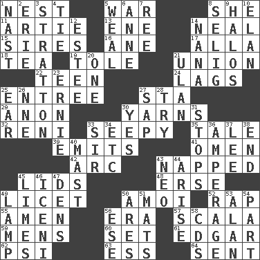 ACROSS 1. Egg locale 5. Armed conflict 8. A female animal or person 11. Nick name for Arthur 13. Compass dir. 14. Be tempered by heat 15. Male parents of animals 16. A saturated hydrocarbon 17. Silent film actress Nazimova 18. Afternoon social gathering 19. Lacquered or enameled metalware 21. The state of being joined or united 22. Adolescent 24. Falls behind 25. Main course 27. R.R. building 29. Soon (poet.) 30. Entertaining tales 32. Painter Guido (1575-1642) 33. Not well drained, as in land 35. Story 39. Gives off 41. Sign of something about to happen 42. Curve 43. Slept 45. Flaplike coverings 48. Celtic language 49. It is permitted: Lat. 50. Mine, in Marseilles 52. Reproach for some lapse or misdeed 55. So be it 56. Period 57. Any of the three canals of the cochlea 59. Not women's 60. Arrange properly for use 61. _ Allan Poe 62. Air pressure measure (abbr.) 63. Curvy letter 64. Transmitted DOWN 1. Political cartoonist Thomas 2. 4th largest of the Great Lakes 3. Ski resort town in Vermont 4. Make a knot 5. Welt 6. Singer Murray 7. Portuguese money of account (variant) 8. Major League Baseball Commissioner Bud 9. Saint headwear 10. Liveliness 12. First name in cosmetics 14. Grandmother 20. Single 21. Uhlan (variant) 23. Bert's buddy 25. Hearing organ 26. Compass dir. 27. Plant excrement 28. Attempt 30. Consenting reply 31. Obstructs or blocks passage 33. Title for a knight 34. And so on (abbr.) 36. Electrical Measurement 37. Area sheltered from the wind 38. Conclusion 40. Vertical spar for supporting sails 43. Modern: prefix 44. Originate 45. Citrus fruits 46. Ancient Celtic tribe of eastern Britain 47. Hiding places for outlaws 49. Desk light 50. Ancient Greek god of war 51. Floor protectors 53. ____ Jay Lerner 54. Role in a play 56. Compass dir. 58. Music discs