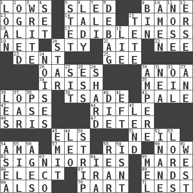 ACROSS 1. Coldest temperatures 5. Downhill vehicle 9. Object of repulsion 13. Legendary monster 14. Falsehood 15. The easternmost of the Lesser Sundas 16. Came down and settled, as after flight 17. The property of being fit to eat 19. Remaining after all deductions 20. Filthy place 21. Small island 22. Born 23. Gouge 25. Unit of force equal to gravity 26. Fertile tracts in a desert 30. Small Philippine buffalo 34. From or relating to Ireland 35. Chow _ 36. Chops off 39. Sadhe (variant) 42. Diluted with white 43. Relaxation 44. Firearm 46. Indian titles of respect 47. Prevent from occurring 48. Raised railways 51. Famous astronaut Armstrong 54. Housemaid (var.) 57. Was introduced to 58. To free from 60. At this time 62. Seigniories (variant) 65. Female horse 66. Voters do this 67. SW Asia republic 68. Conclusions 69. In addition 70. Piece 71. For fear that DOWN 1. Grant temporary use of 2. Stared 3. Compose 4. Arrange properly for use 5. Proofreading order 6. Kenny Rogers chart-topper in '80 7. Biblical high priest 8. Debunk (Brit. slang) 9. Storage container 10. So be it 11. Olfactory organ 12. Celtic language 15. False hair 18. Untruth 20. Play the lead 24. Annoying sounds 27. Be seated 28. Curvy letter 29. Broken piece 30. Electrical Unit 31. Teachers' org. 32. Petroleum 33. One (Scot) 36. French article 37. Boat paddle 38. 23rd letter of the Greek alphabet 40. Expire 41. Newt 45. Grant temporary use of 48. Send forth 49. Lion 50. Long narrow piece of something 52. Lacking in sense or substance 53. Nobles 54. Toward the sea 55. Place where flour is made 56. Ripens 58. Stern 59. Is not 61. 270 degrees 63. Non-commissioned officer (abbr.) 64. Retirement account (abbr.) 65. Cartoonist voice _ Blanc