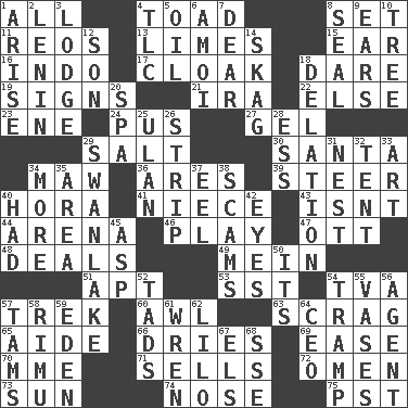 ACROSS 1. Everything 4. Frog relative 8. Arrange properly for use 11. Vintage cars 13. Citrus fruits 15. Hearing organ 16. _ china 17. Loose outer garment 18. Have the gumption 19. Attaches a signature 21. Lyricist Gershwin 22. Otherwise 23. Compass dir. 24. Product of festering 27. Set 29. Table seasoning 30. Before Barbara or Clara 34. Informal term for the mouth 36. Ancient Greek god of war 39. Guide 40. Israeli folk dance 41. Sibling's daughter 43. Is not 44. Sports stadium 46. Live dramatic performance 47. Baseball player Mel 48. Allots cards 49. Count _ (2 wds.) 51. Fitting 53. Fast jet (abbr.) 54. Federal power corp. 57. Long journey 60. Leather borer 63. Lean end of the neck 65. Assistant 66. Frees from moisture 69. Relaxation 70. Madame (abbr.) 71. Exchanges for money 72. Sign of things to come 73. Player for Phoenix 74. Characteristic smell of wine 75. Pacific Standard Time (abbr.) DOWN 1. Ascend 2. Soviet premier 1918-24 3. Inn 4. Affectionate concern, for short 5. Petroleum 6. Mine, in Marseilles 7. Letter starter 8. Lick closed 9. Hearing organs 10. Woody plant 12. Male child 14. Heroin 18. Accusation by an informer 20. Health resort 25. ____ Bator 26. Long narrow piece of something 28. Double-curved letter 29. Tchaikovsky ballet 31. A home for chicks 32. Portable shelter 33. Nonscientific branch of learning 34. Greater amount 35. Length times width 37. Snakelike fish 38. Fraudulent business schemes 40. Possessed 42. Snake ____ (dice throw) 45. Cleo's killer 50. It is 52. Small amounts or degrees 54. _____ steamer (cargo ship) 55. Flower holders 56. Rep 57. Scottish caps 58. Tall New Zealand timber tree 59. Genesis locale 61. Songbird 62. _ and Stitch 64. Corporate head (abbr.) 67. Raised railways 68. Compass dir.